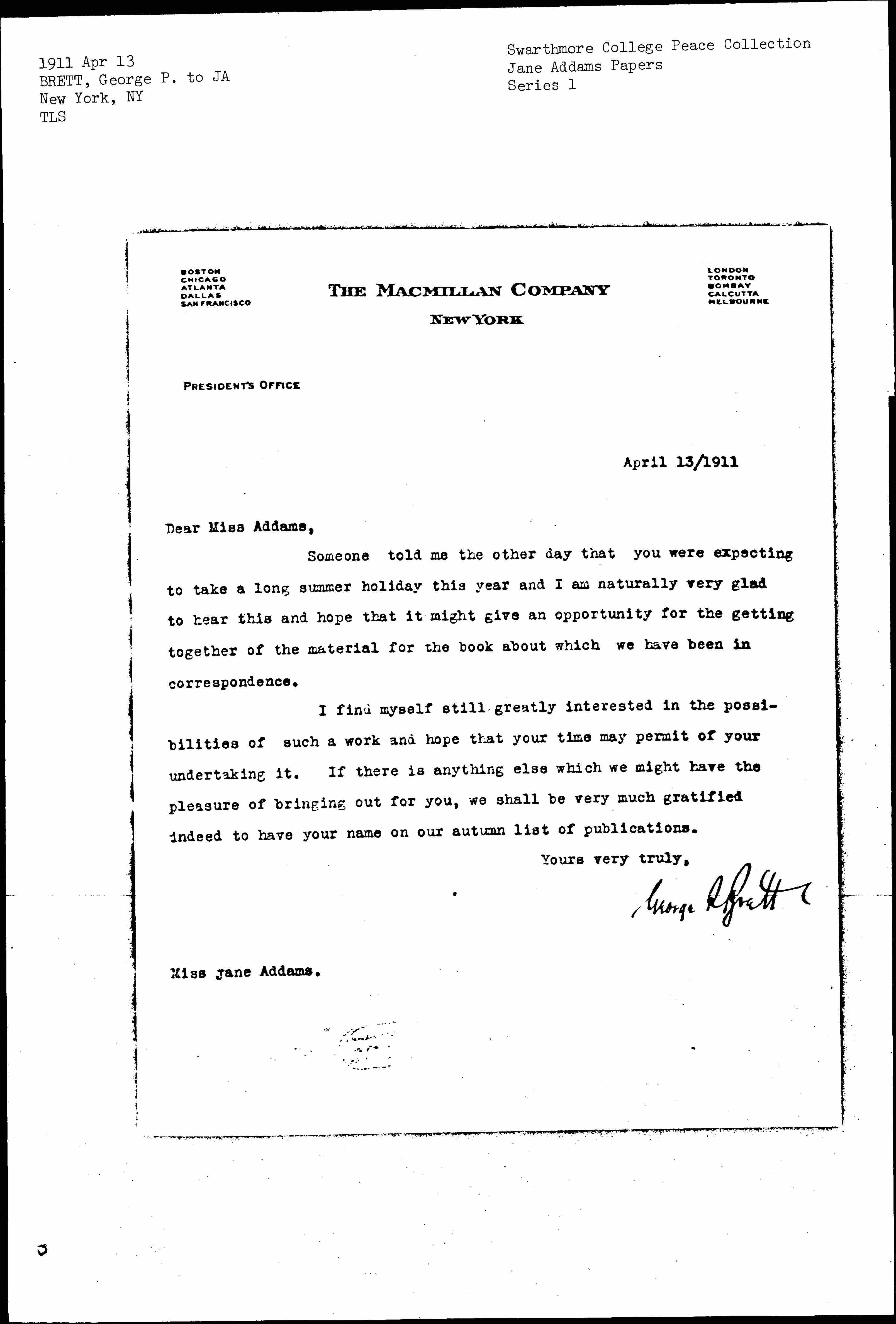 I find myself still greatly interested in the possibilities of such a work and hope that your time may permit of your undertaking it. If there is anything else which we might have the pleasure of bringing out for you, we shall be very much gratified indeed to have your name on our autumn list of publications.