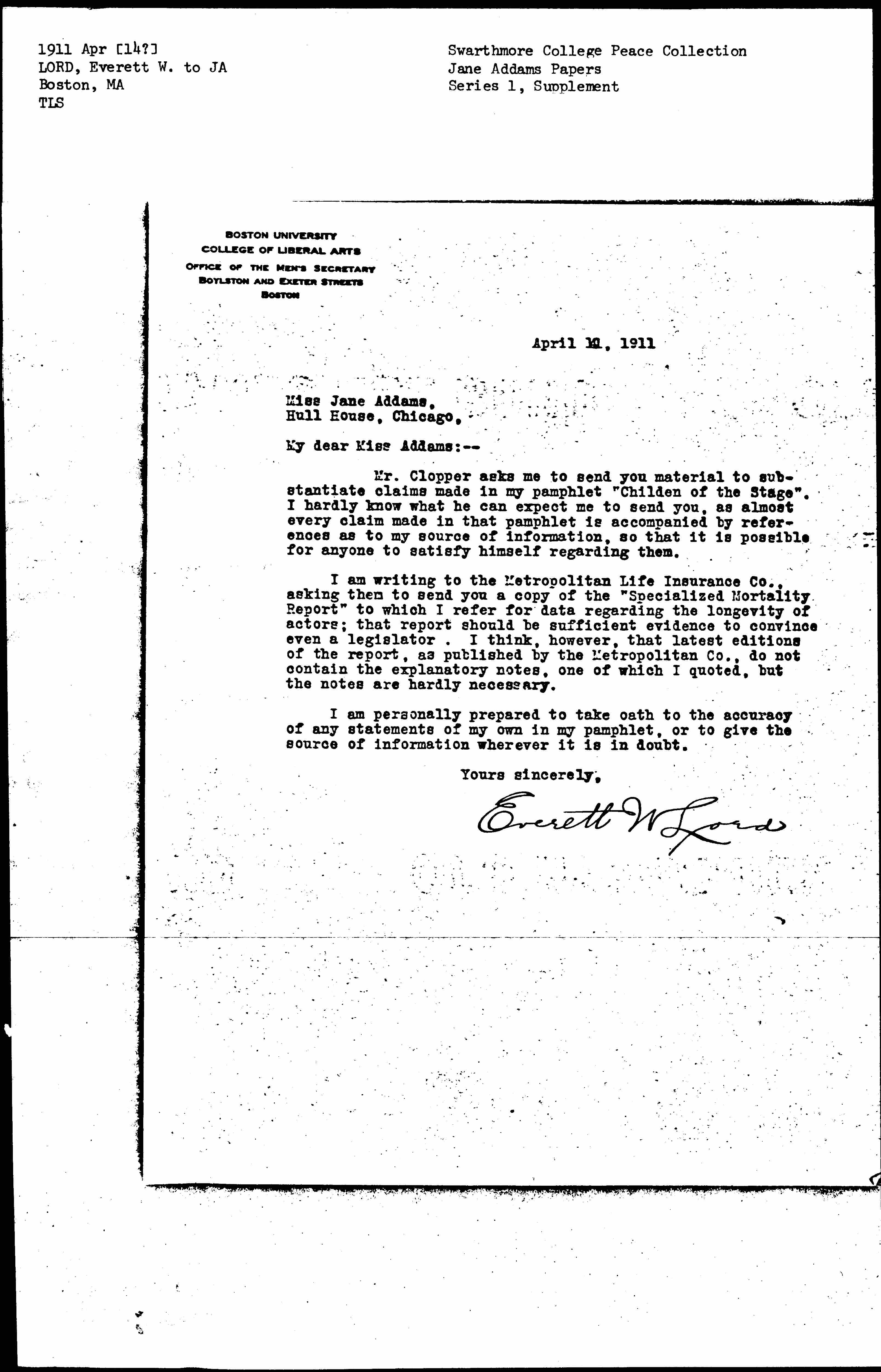 I am writing to the Metropolitan Life Insurance Co., asking them to send you a copy of the "Specialized Mortality Report" to which I refer for data regarding the longevity of actors; that report should be sufficient evidence to convince even a legislator. I think, however, that latest editions of the report, as published by the Metropolitan Co., do not contain the explanatory notes, one of which I quoted, but the notes are hardly necessary.