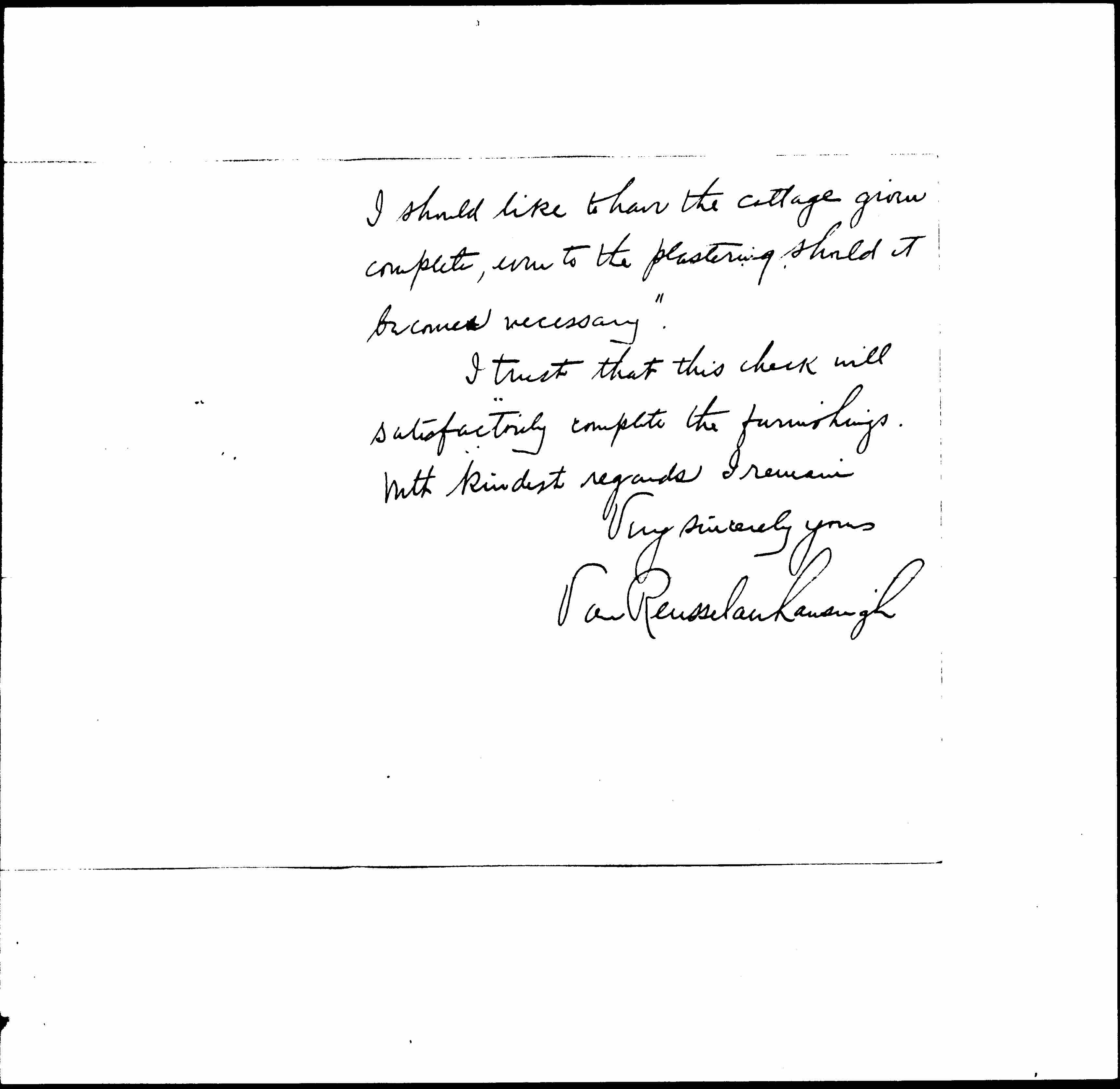 I trust that this check will satisfactorily complete the furnishings. With kindest regards I remain