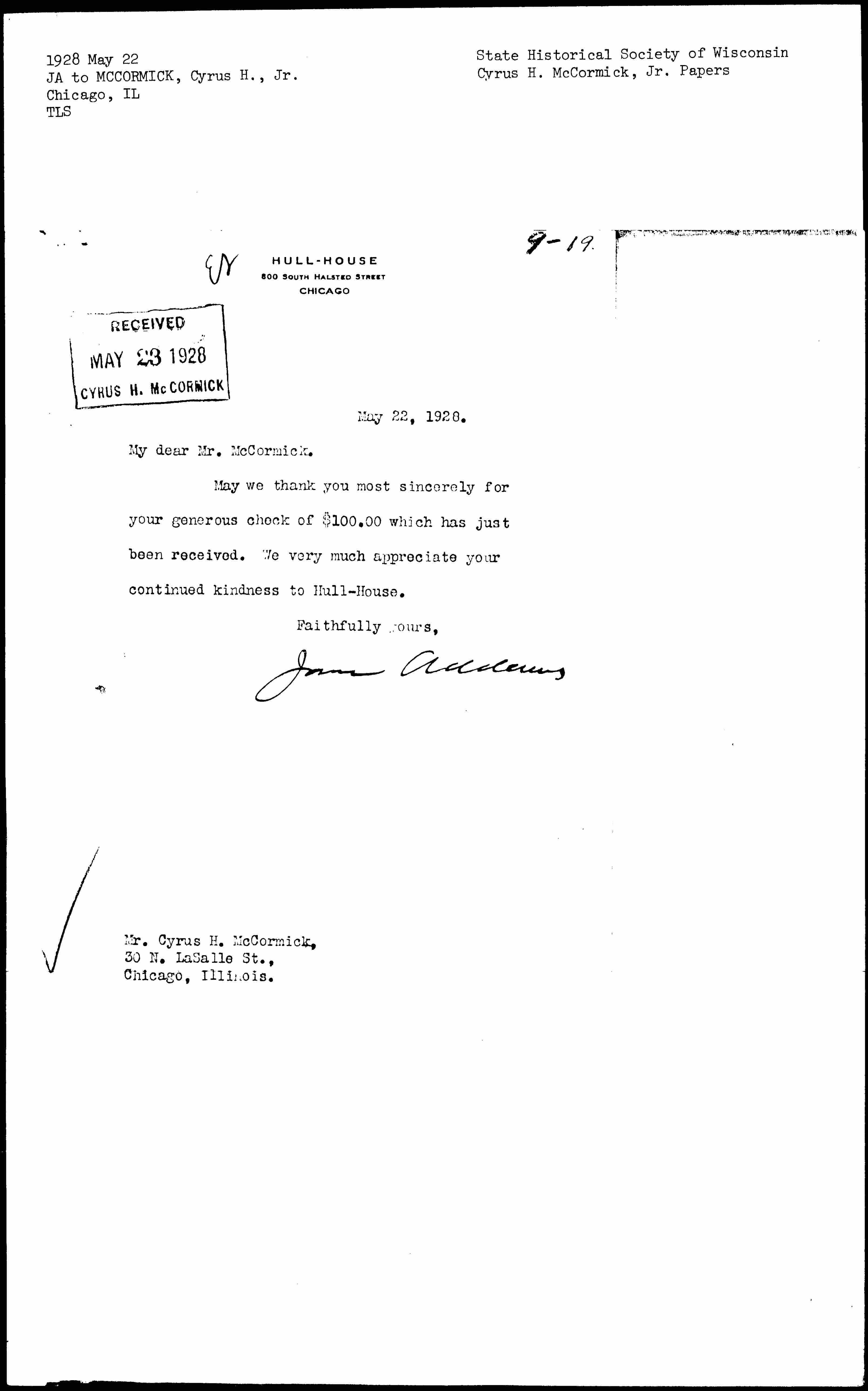 Jane Addams to Cyrus Hall McCormick Jr., May 22, 1928