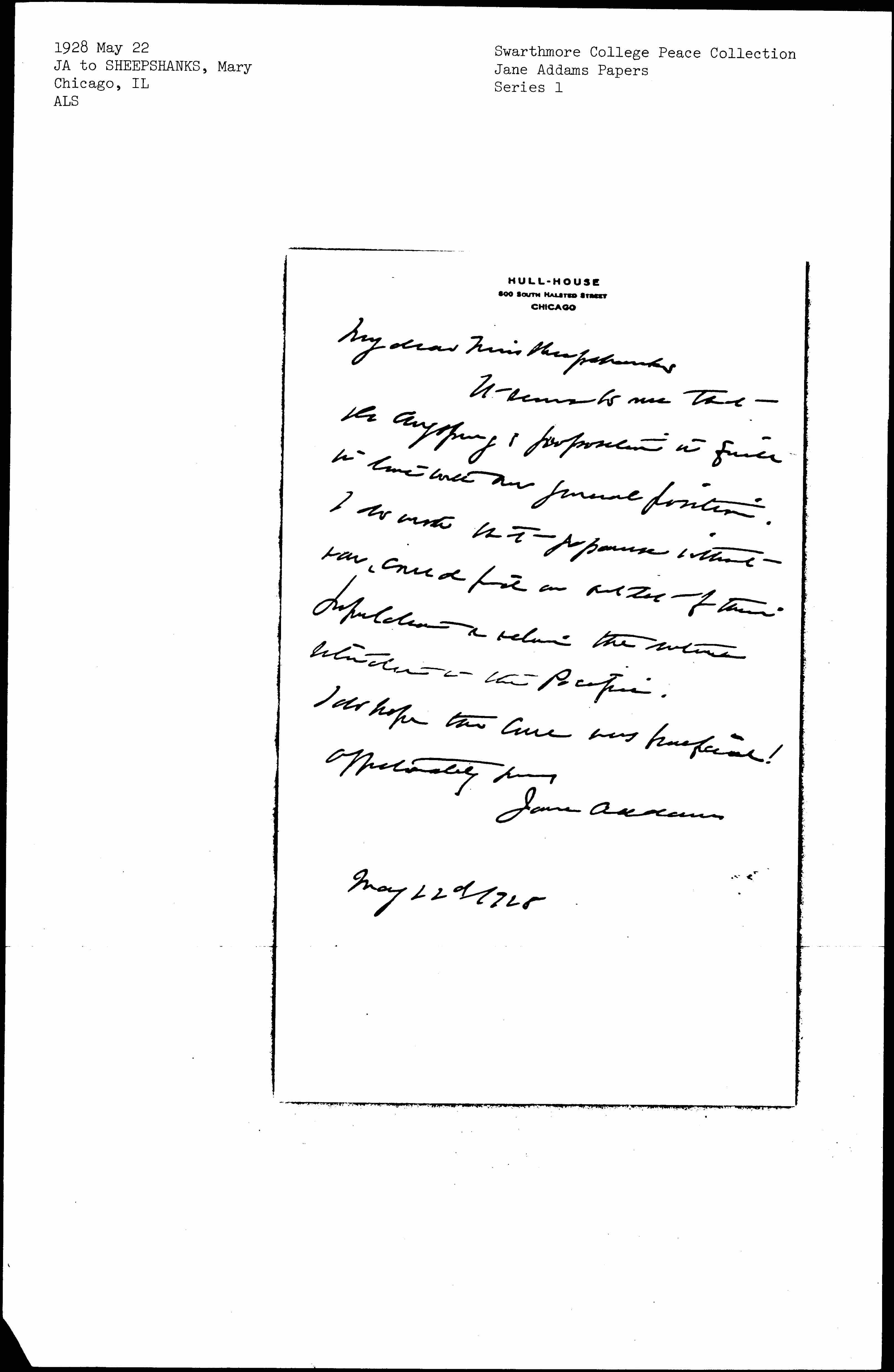 Jane Addams to Mary Ryott Sheepshanks, May 22, 1928