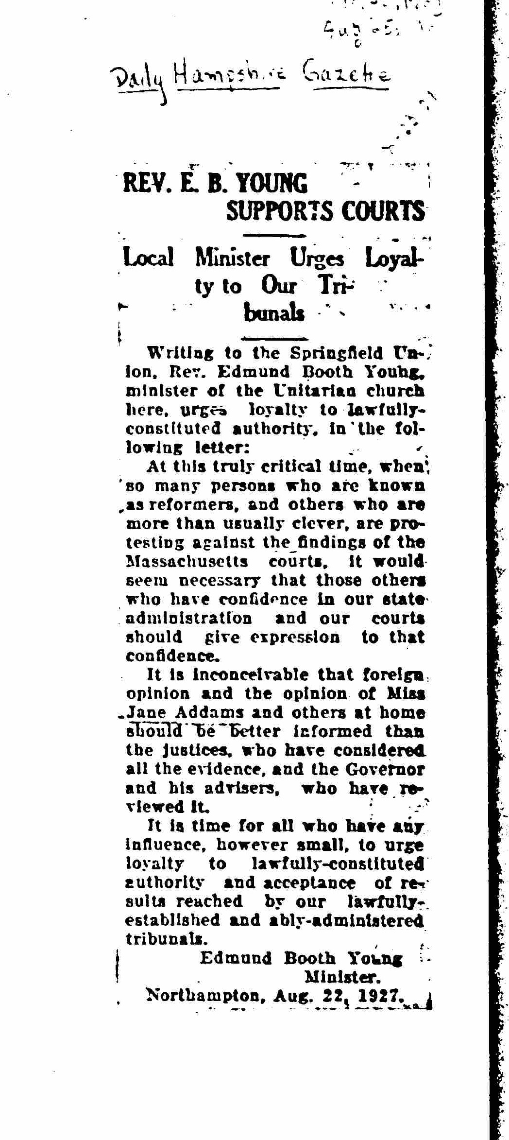 Rev. E. B. Young Supports Courts, August 22, 1927