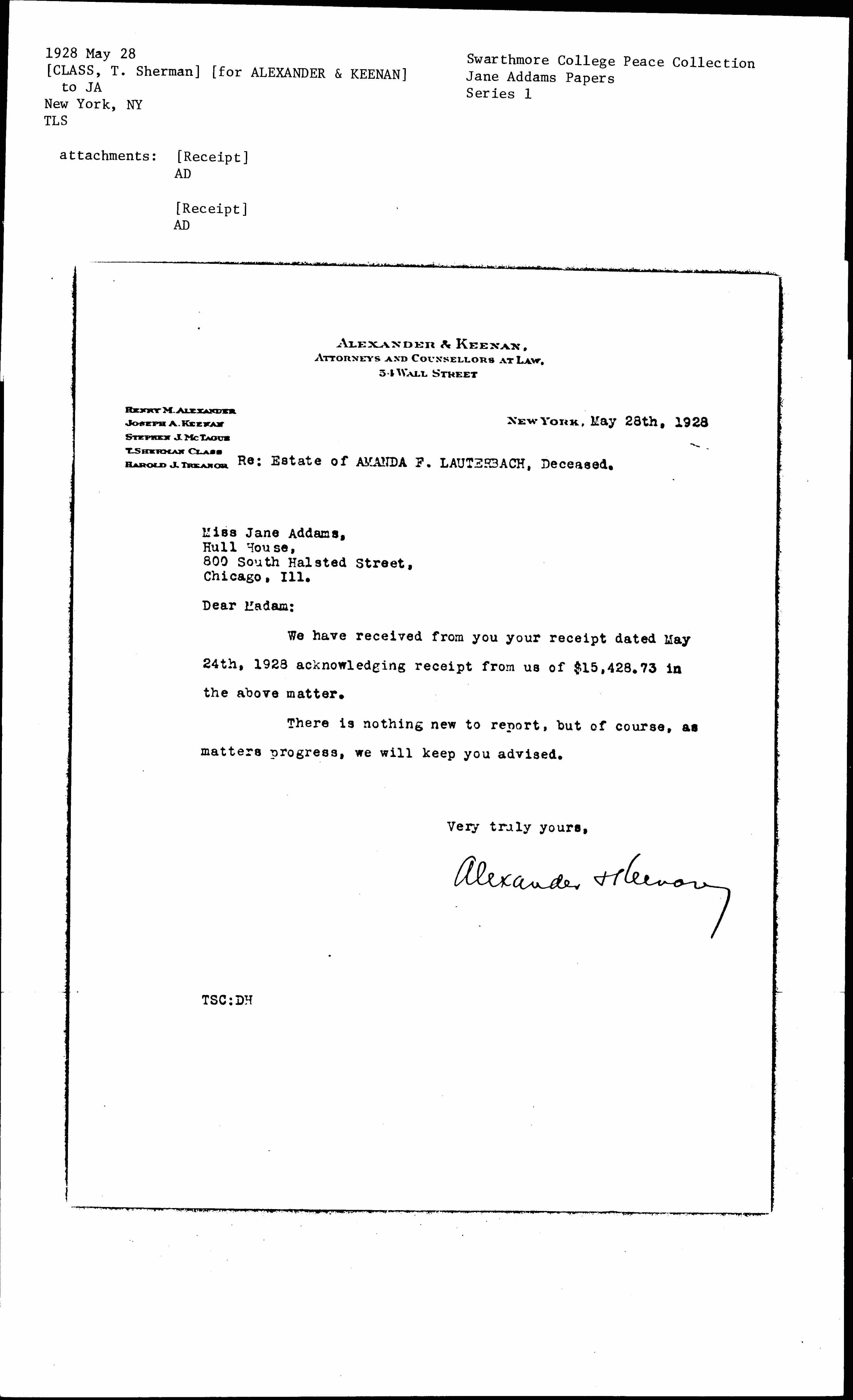 Jane Addams Note on Lauterbach Bequest, May 24, 1928