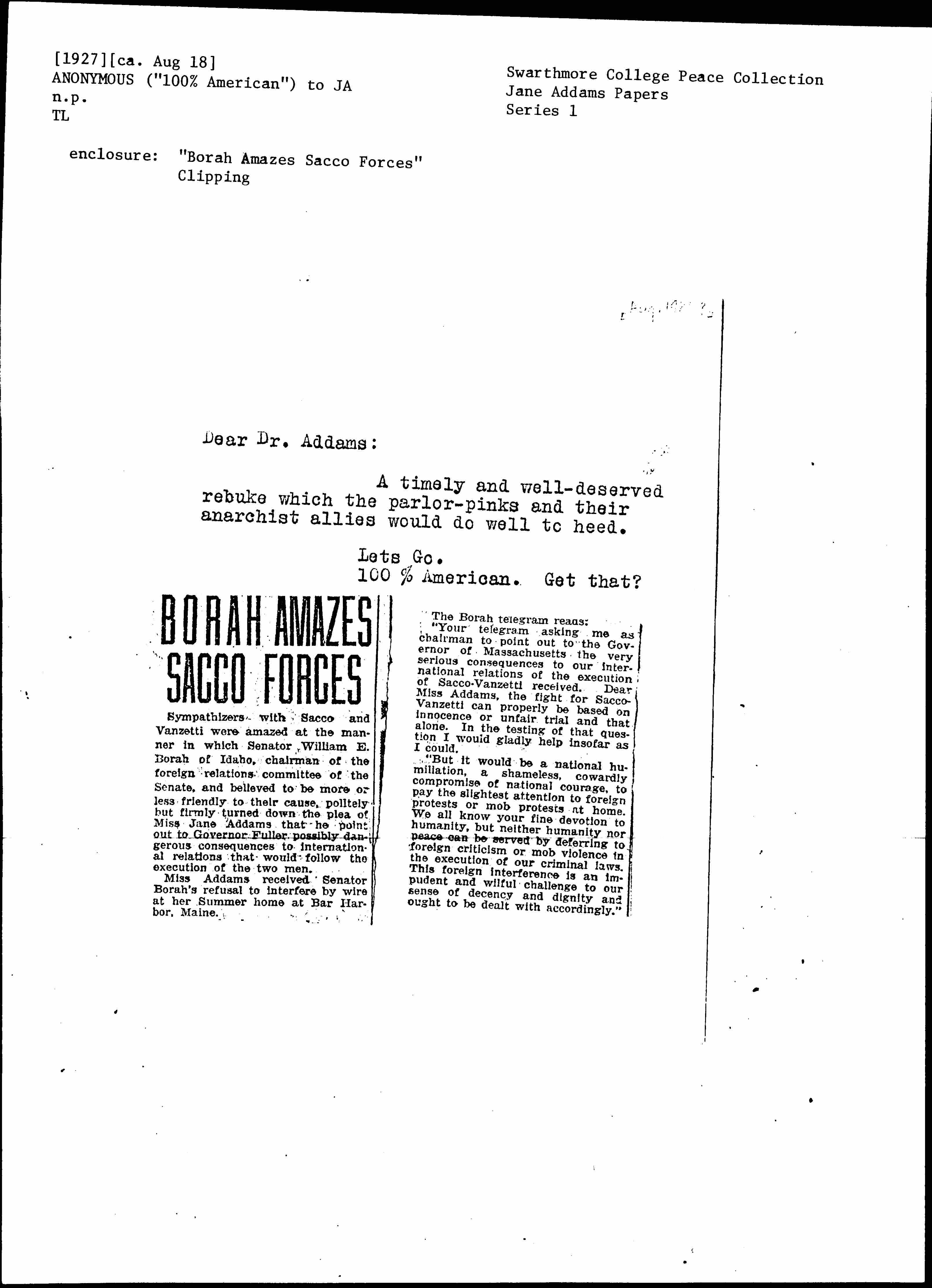 "Your telegram asking me as chairman to point out to the Governor of Massachusetts the very serious consequences to our international relations of the execution of Sacco-Vanzetti received. Dear Miss Addams, the fight for Sacco-Vanzetti can properly be based on innocence or unfair trial and that alone. In the testing of that question I would gladly help insofar as I could.