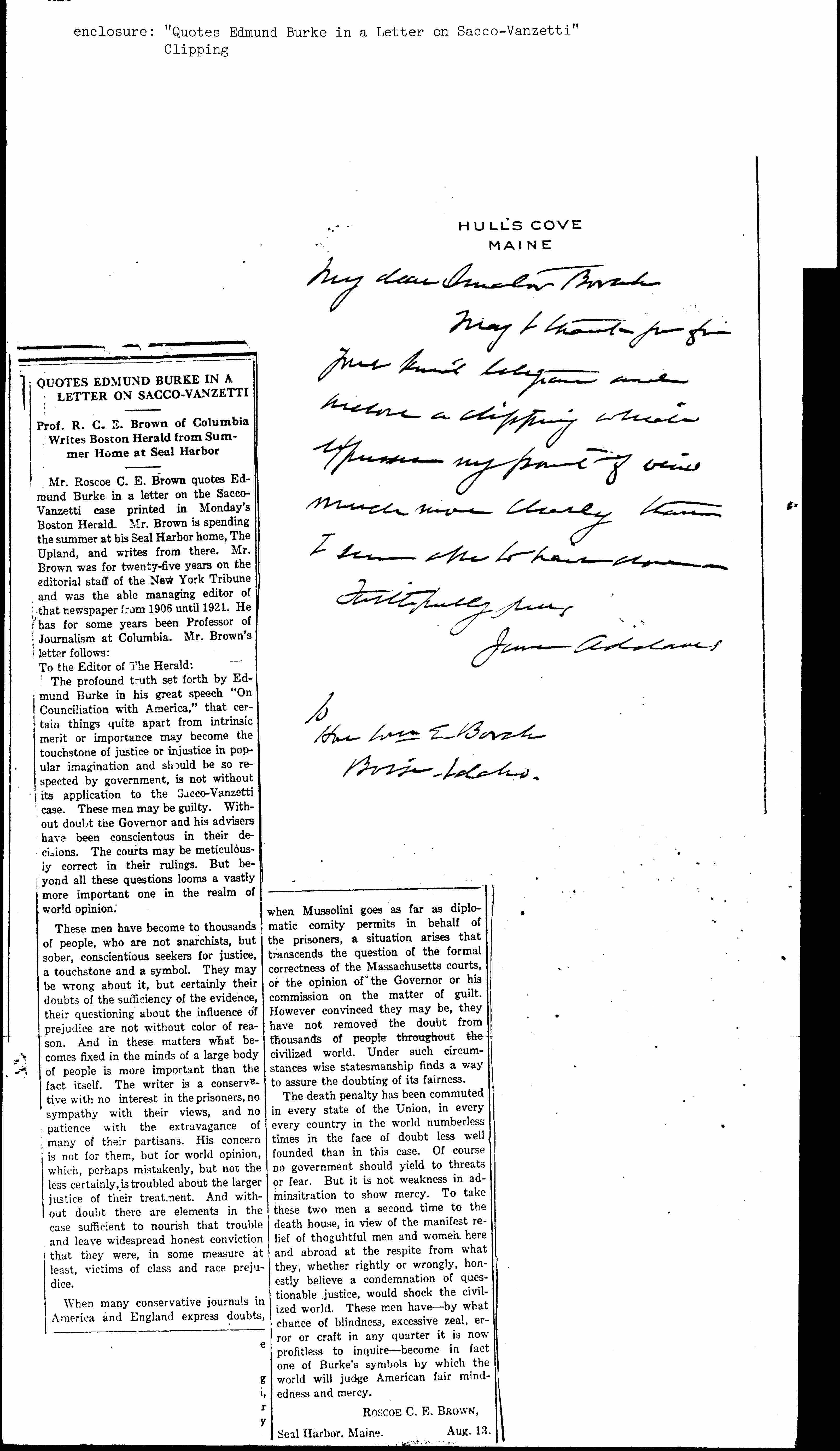 Mr. Roscoe C. E. Brown quotes Edmund Burke in a letter on the Sacco-Vanzetti case printed in Monday's Boston Herald. Mr. Brown is spending the summer at his Seal Harbor home, The Upland, and writes from there. Mr. Brown was for twenty-five years on the editorial staff of the New York Tribune and was the able managing editor of that newspaper from 1906 until 1921. He has for some years been Professor of Journalism at Columbia. Mr. Brown’s letter follows: