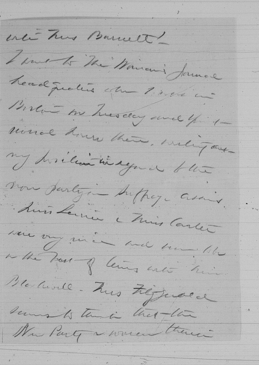 Miss Levine & Miss Carter were very nice and seem to be on the best of terms with Miss Blackwell. Mrs FitzGerald seems to think that the New Party & women therein [page 3] was fine material for forcing the other parties. She had already moved very successfully upon the Democratic Governor of Mass.