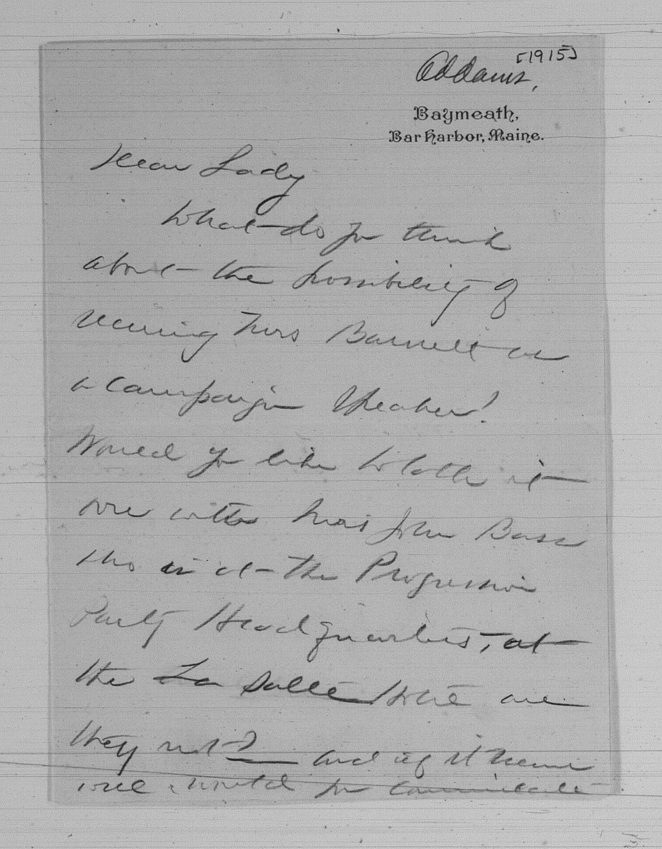 Would you like to talk it over with Mrs John Bass who is at the Progressive Party Headquarters, at the La Salle Hotel are they not? -- and if it seems well should you communicate [page 2] with Mrs Barnett?