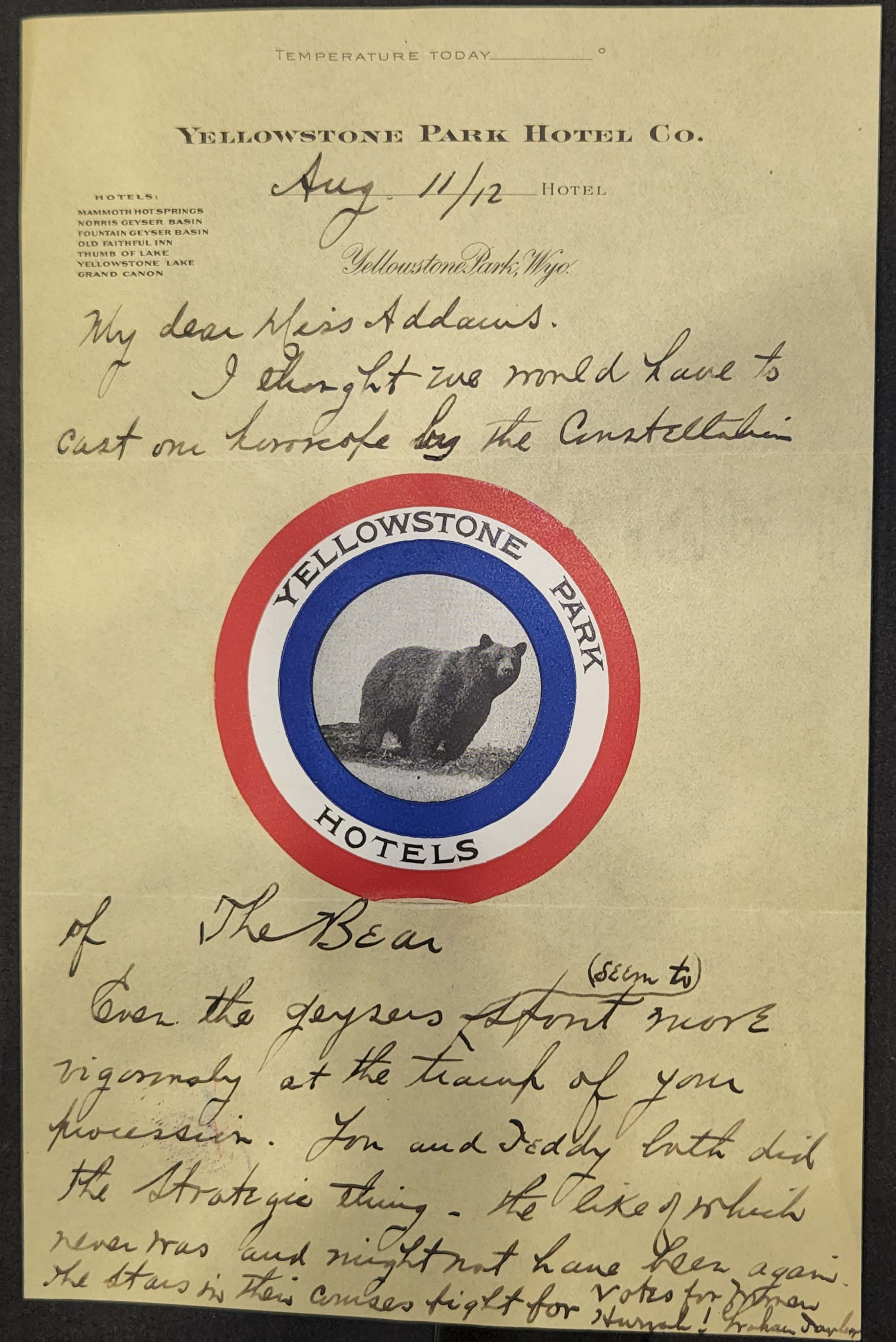 Even the geysers ↑(seem to)↓ spout more vigorously at the tramp of your procession. You and Teddy both did the strategic thing -- the like of which never was and might not have been again. The stars in their courses fight for votes for women.