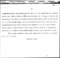 I was greatly puzzled by Miss Johnson's telegram asking whether she should follow your advice or my advice. As she perhaps told you I telegraphed back immediately that she was certainly to follow your and Miss Breckinridge's [advice], that I could not imagine any serious conflict. Her letter received this [morning] explains that she misunderstood me when we were talking about the Ways and [Means] Committee. I suggested that it might be well to ask only women to be members of the Ways and Means Committee and she very naturally understood this as meaning that she was not to ask for subscriptions from men. Another misunderstanding seems to have been about the Woman's Journal. After Miss Blackwell sent out her attack on Headquarters' officers it seemed to our Ways and Means Committee that the whole question of the Journal was involved in such great difficulty that it would be better not to beg for the Journal alone but to beg for the expenses of the National and for the expenses of the Journal as part of the expenses of the National. You remember that our first decision was to beg only for the Journal and I had prepared an appeal for the Ways and Means Committee speaking of the Journal alone. In explaining this to Miss Johnson probably I did not take time [enough] to make it clear that of course where people felt like giving to the Journal it was best to ask them to give to the National in order to help out the Journal. I hope very much that you and Miss Breckinridge will not think that I meant [page 2] to give Miss Johnson any instructions that were not in accordance with your instructions to her. When our Ways and Means Committee sent her to Chicago it was with the understanding that while in the west she should work directly under the instructions of you and Miss Breckinridge. As I am particularly anxious that there should be no misunderstanding about this I should be very grateful to you if you would kindly take the time to read my letter to her a copy of which I enclose. I am sending a duplicate of this letter to Miss Breckinridge and also a copy of my letter to you.