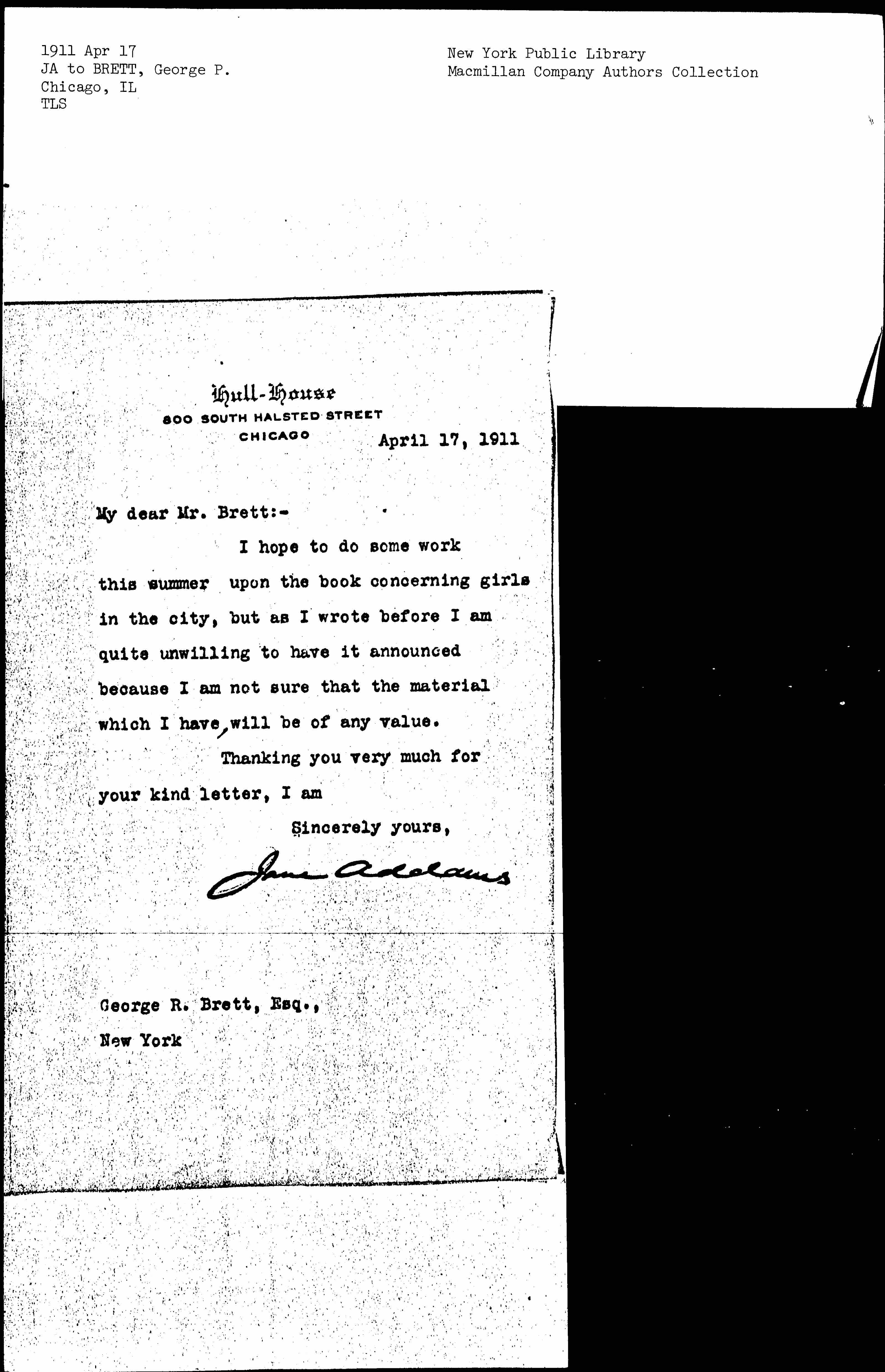 I hope to do some work this summer upon the book concerning girls in the city, but as I wrote before I am quite unwilling to have it announced because I am not sure that the material which I have will be of any value.