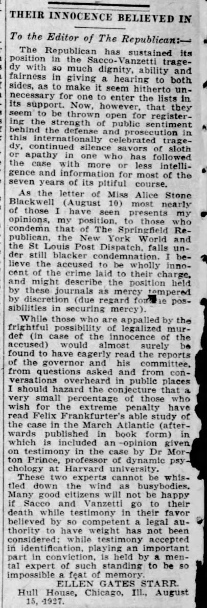 Ellen Gates Starr to the Editor of the Springfield Republican, August 15, 1927