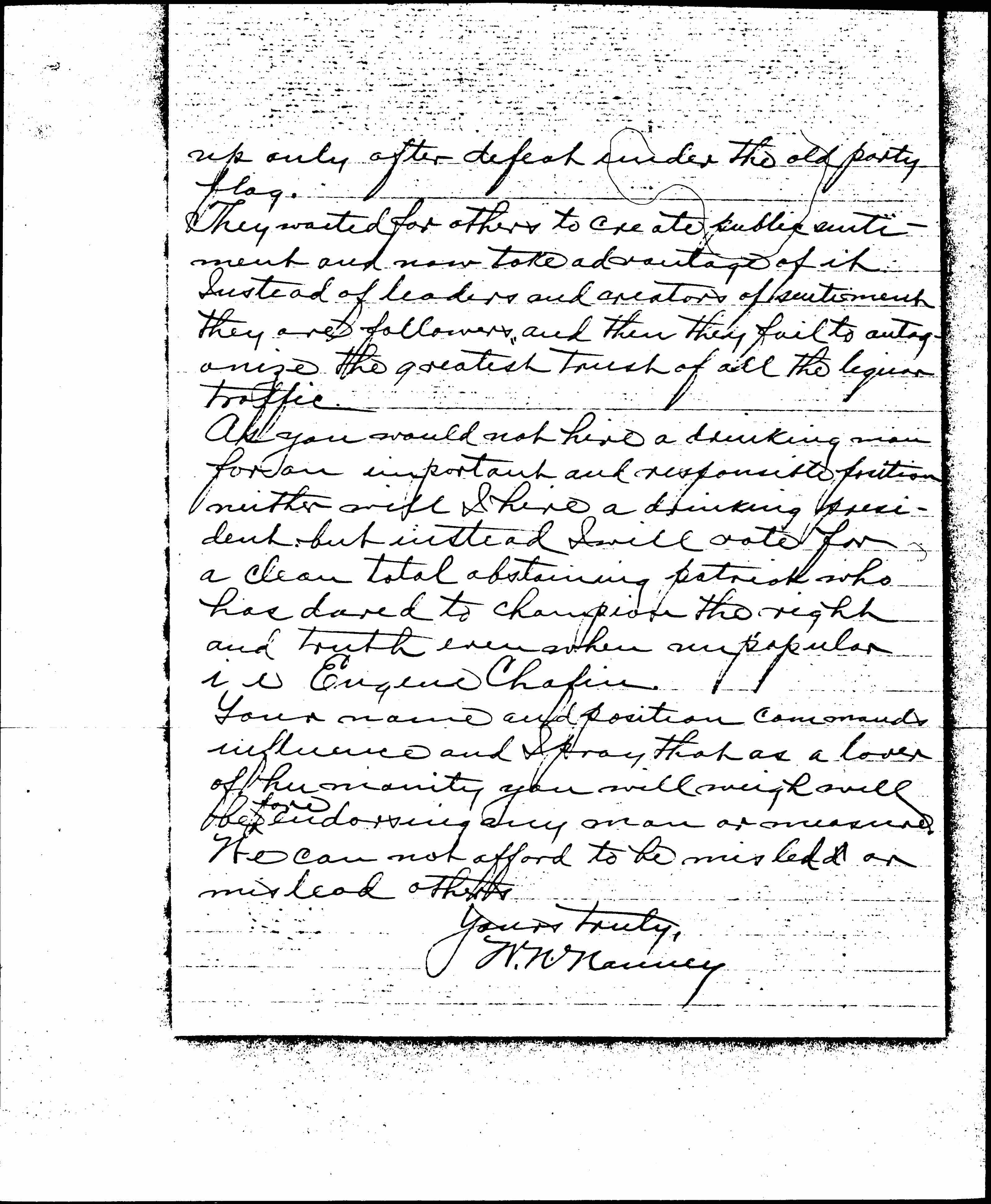 As you would not hire a drinking man for an important and responsible position neither will I hire a drinking president, but instead I will vote for a clean total abstaining patriot who has dared to champion the right and truth even when unpopular ie Eugene Chafin.