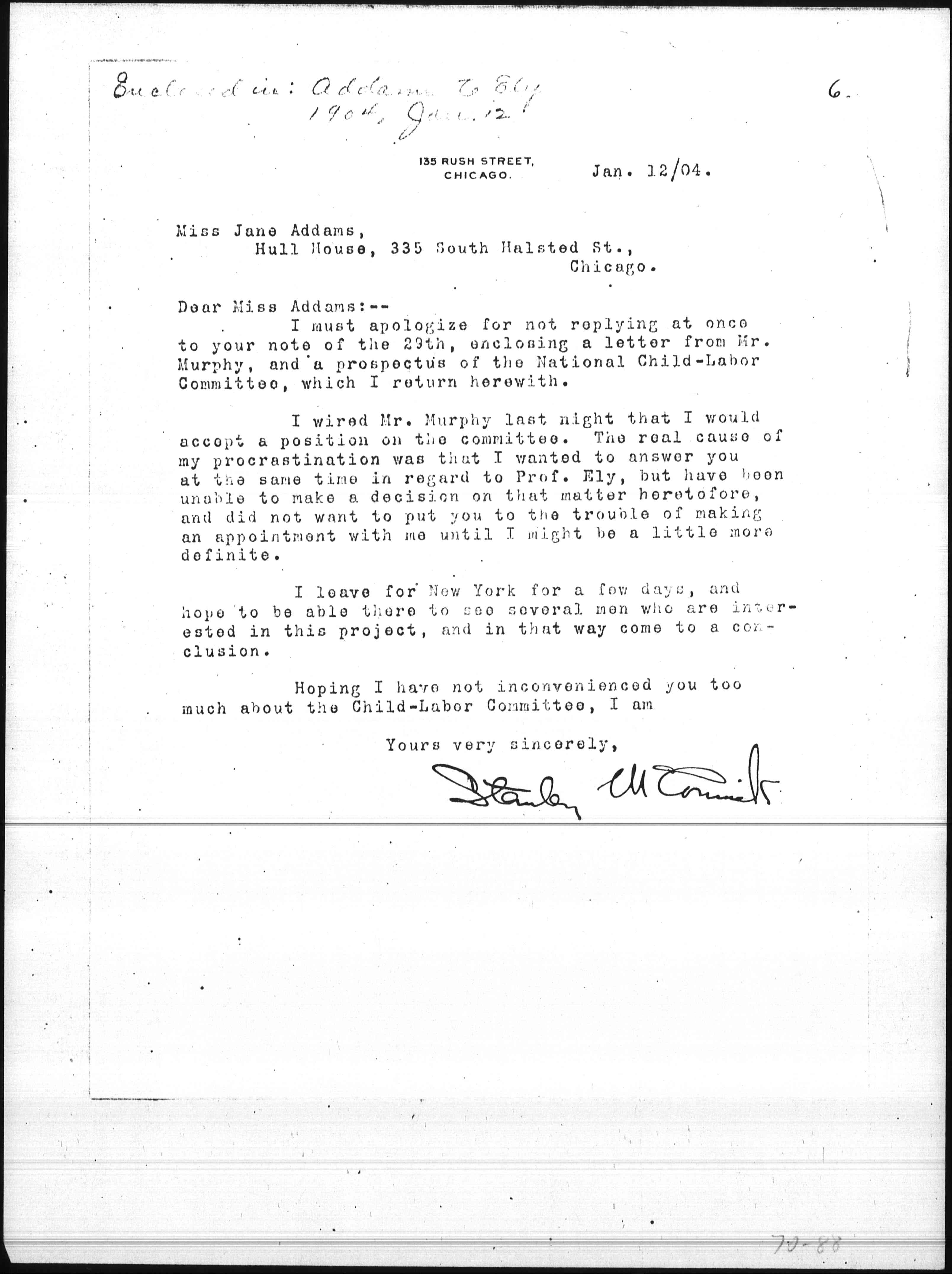 I must apologize for not replying at once to your note of the 29th, enclosing a letter from Mr. Murphy, and a prospectus of the National Child-Labor Committee, which I return herewith.