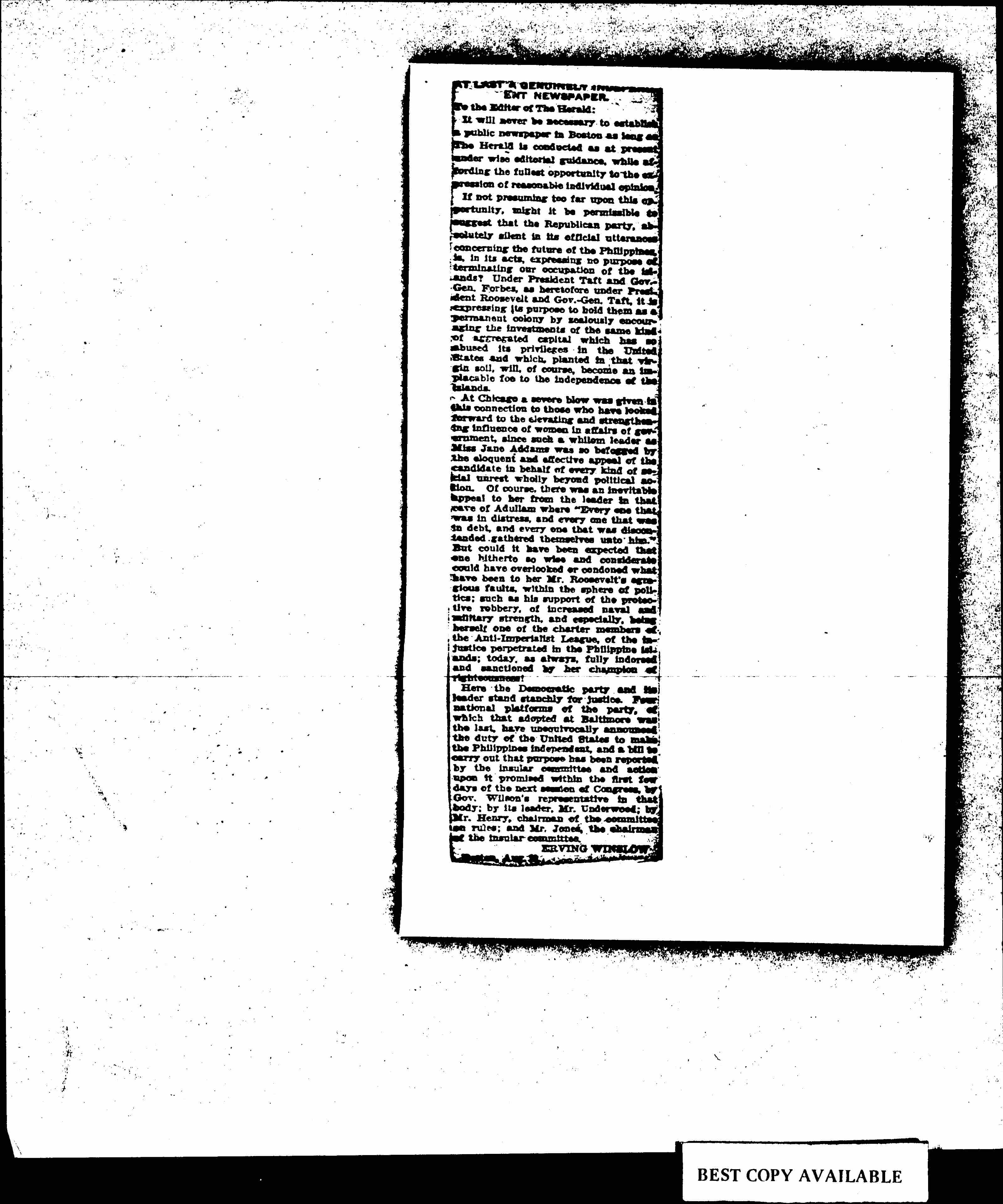 Here the Democratic party and its leader stand [staunchly] for justice. Four national platforms of the party, of which that adopted at Baltimore was the last, have unequivocally announced the duty of the United States to make the Philippines independent, and a bill to carry out that purpose has been reported by the insular committee and action upon it promised within the first few days of the next session of Congress, by Gov. Wilson's representative in that body; by its leader, Mr. Underwood; by Mr. Henry, chairman of the committee [illegible] rules; and Mr. Jones, the chairman of the insular committee.
