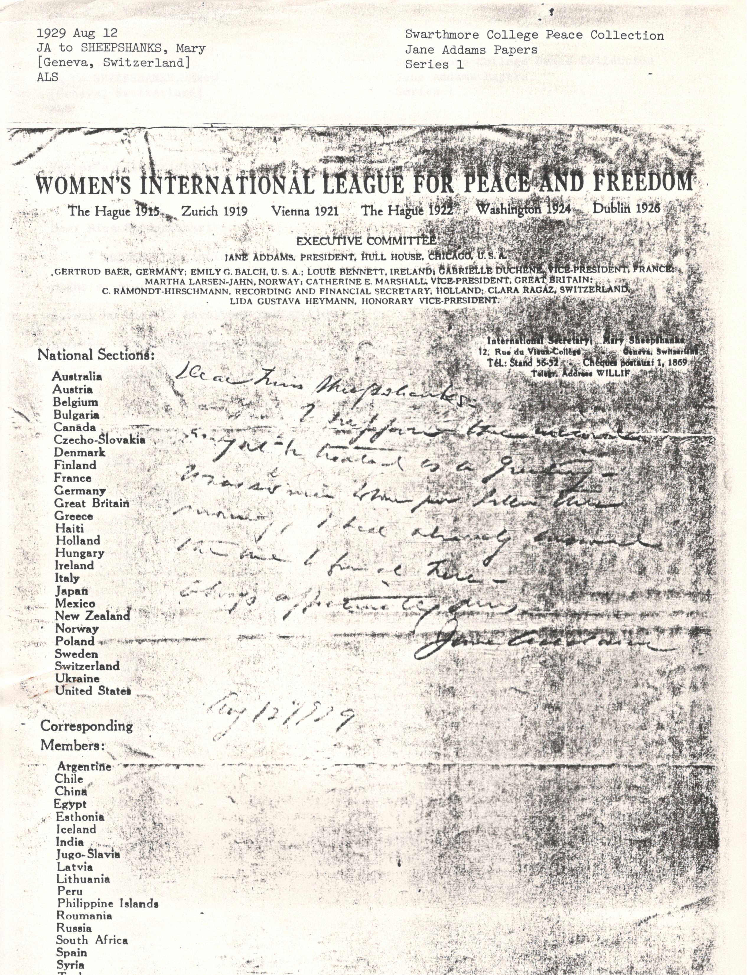 Jane Addams to Mary Ryott Sheepshanks, August 12, 1929