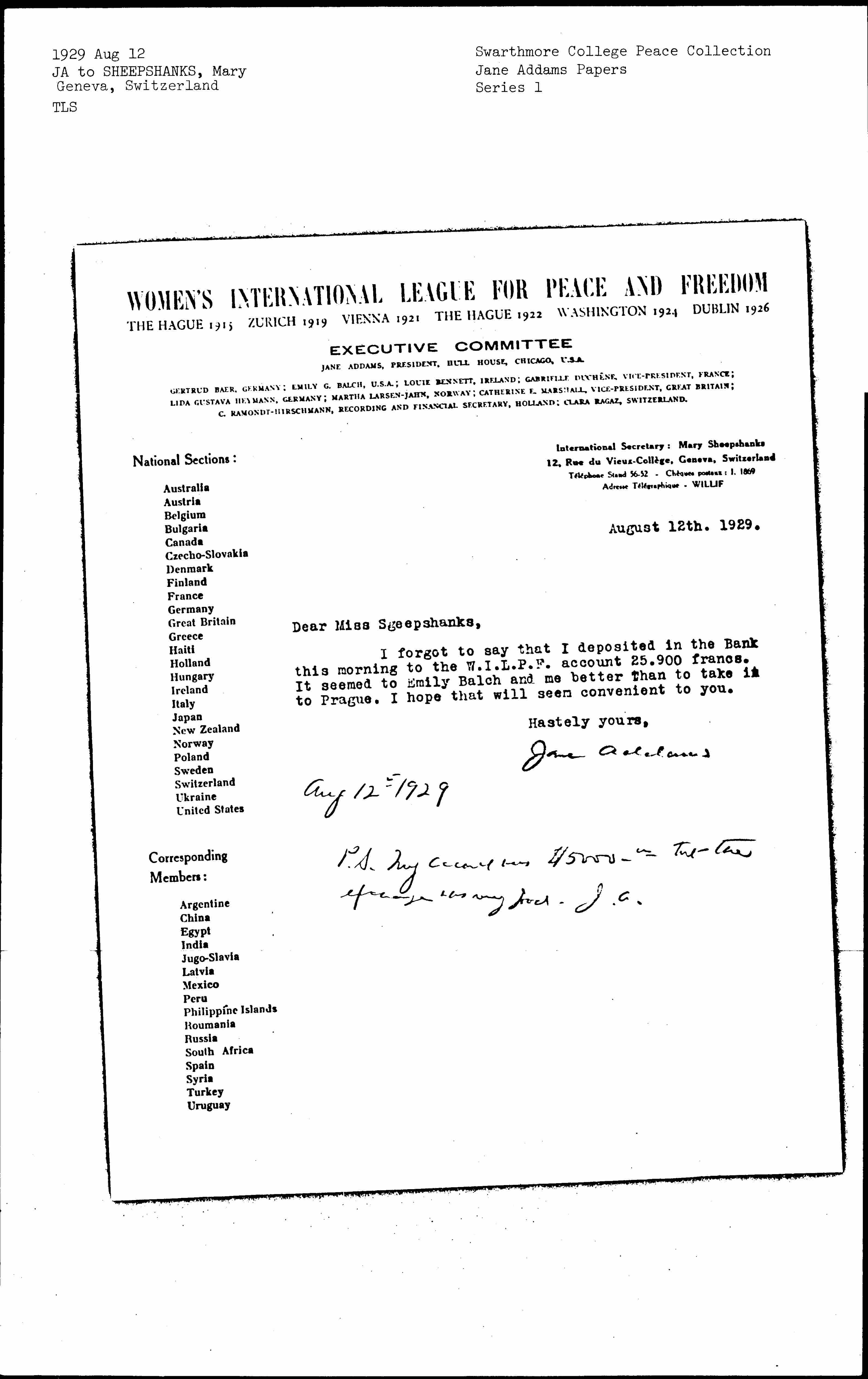 Jane Addams to Mary Ryott Sheepshanks, August 12, 1929