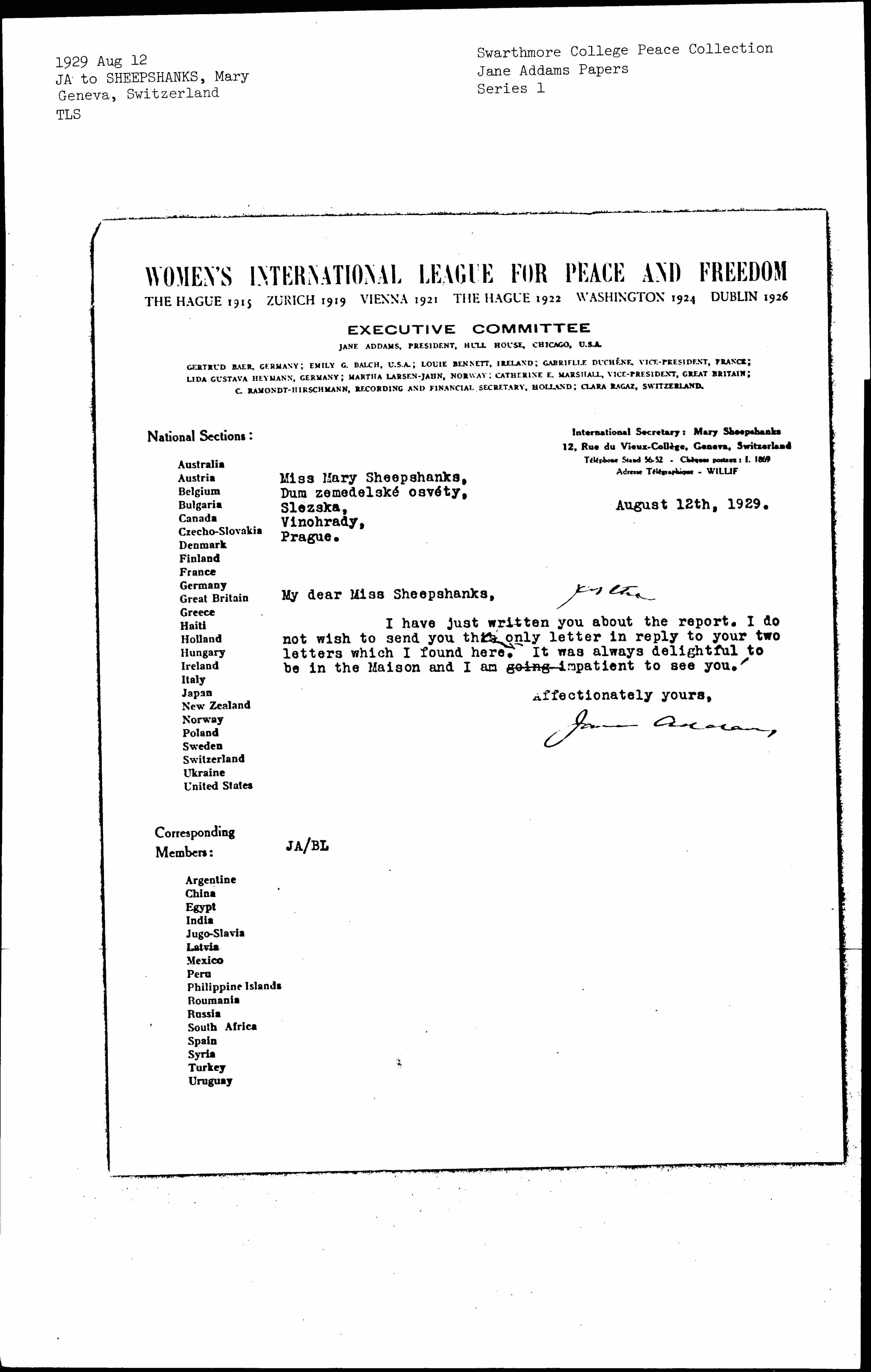 Jane Addams to Mary Ryott Sheepshanks, August 12, 1929