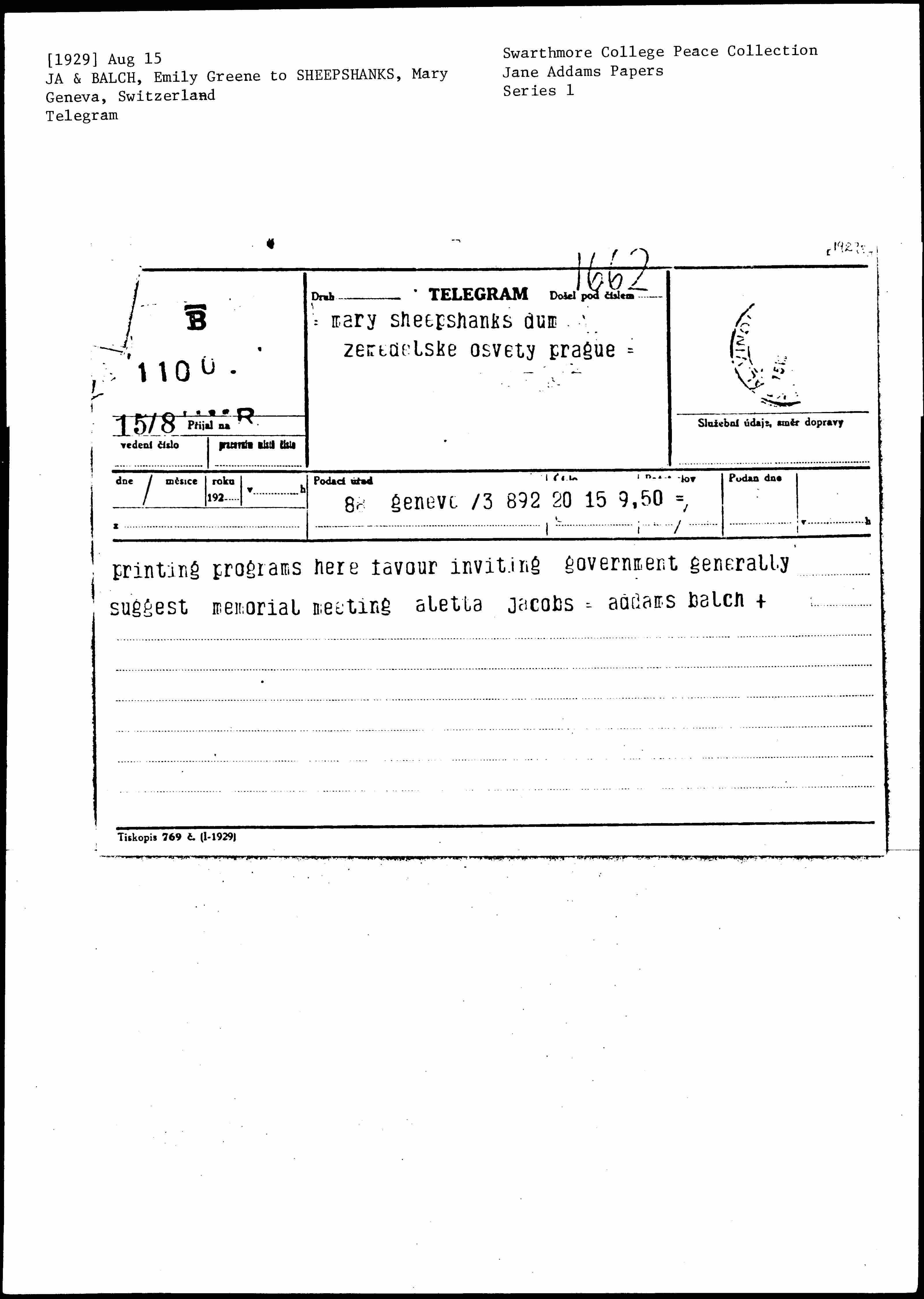 Jane Addams and Emily Greene Balch to Mary Ryott Sheepshanks, August 15, 1929