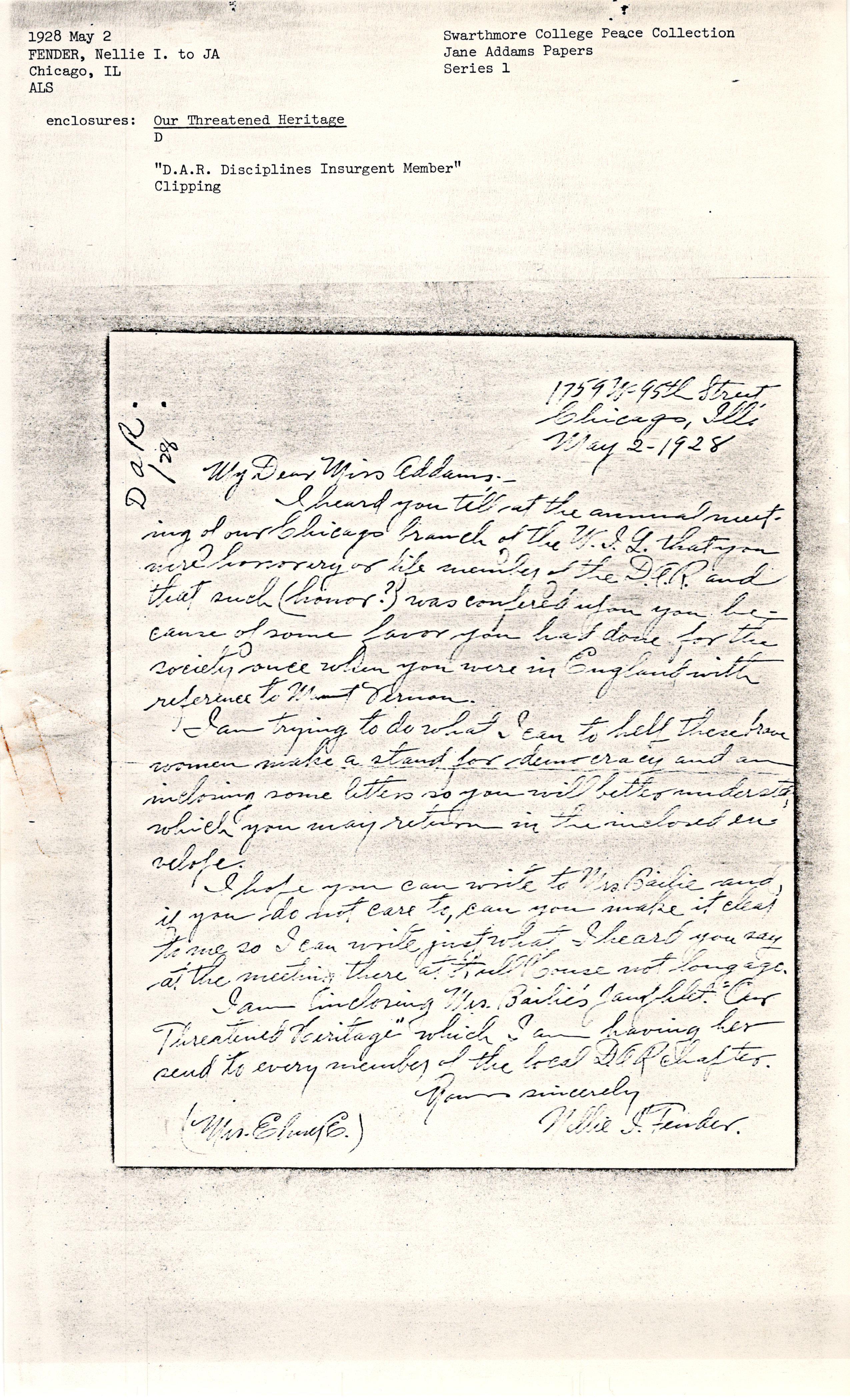 Nellie Irene Grimwood Fender to Jane Addams, May 2, 1928
