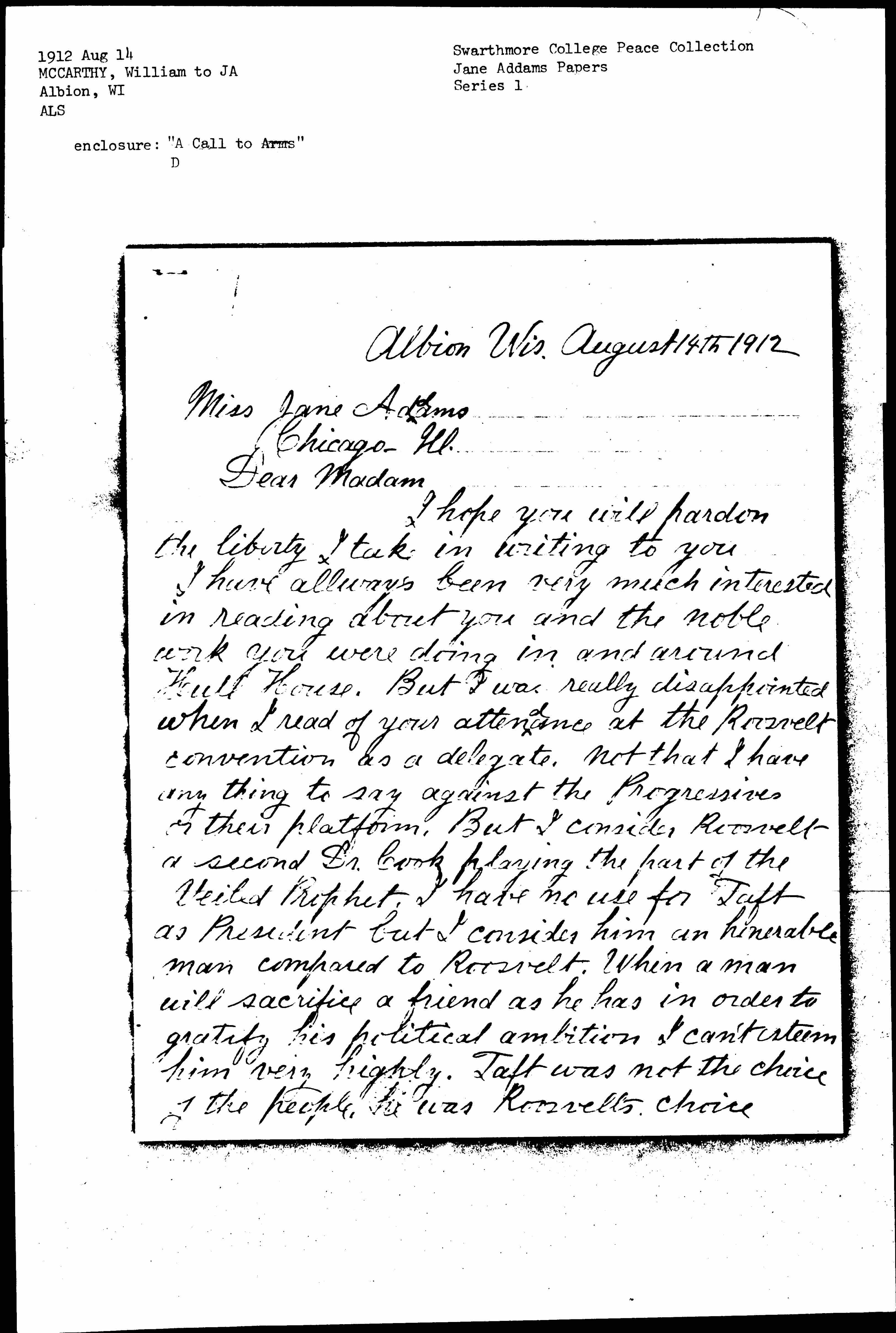 I have [always] been very much interested in reading about you and the noble work you were doing in and around Hull House. But I was really disappointed when I read of your attendance at the Roosevelt convention as a delegate, not that I have [anything] to say against the Progressives or their platform. But I consider Roosevelt a second Dr. Cook playing the part of the Veiled Prophet. I have no use for Taft as President but I consider him an honorable man compared to Roosevelt. When a man will sacrifice a friend as he has in order to gratify his political ambition I can't esteem him very highly. Taft was not the choice of the people, he was Roosevelt's choice [page 2]