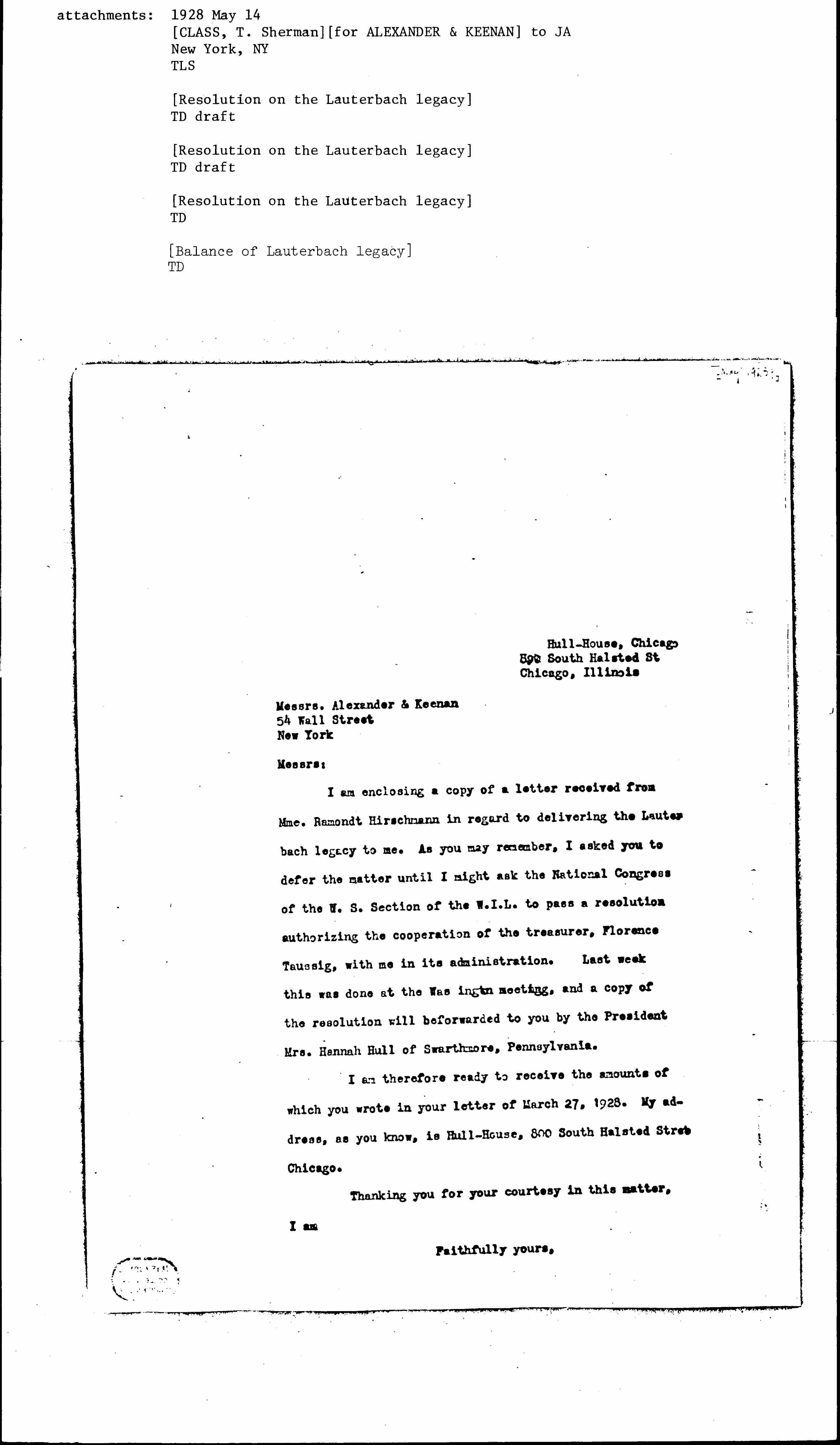 Theodore Sherman Class to Jane Addams, May 14, 1928