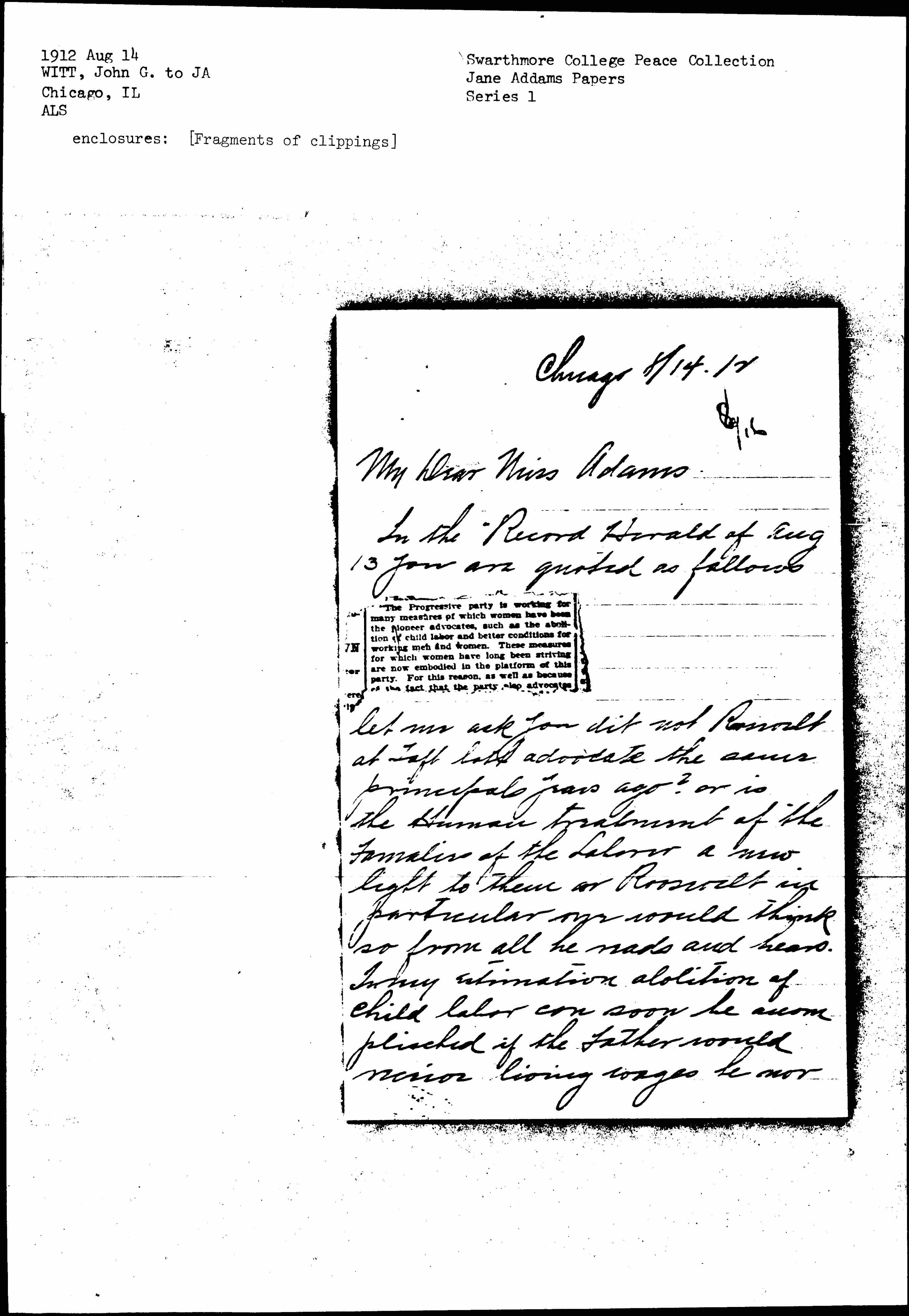 [fragment of newspaper clipping attached to the page] "The Progressive Party is working for many measures of which women have been the pioneer advocates, such as the abolition of child labor and better conditions for working men and women. These measures for which women have long been striving are now embodied in the platform of this party. For this season, as well as because of the fact that the party also advocates [end of fragment]