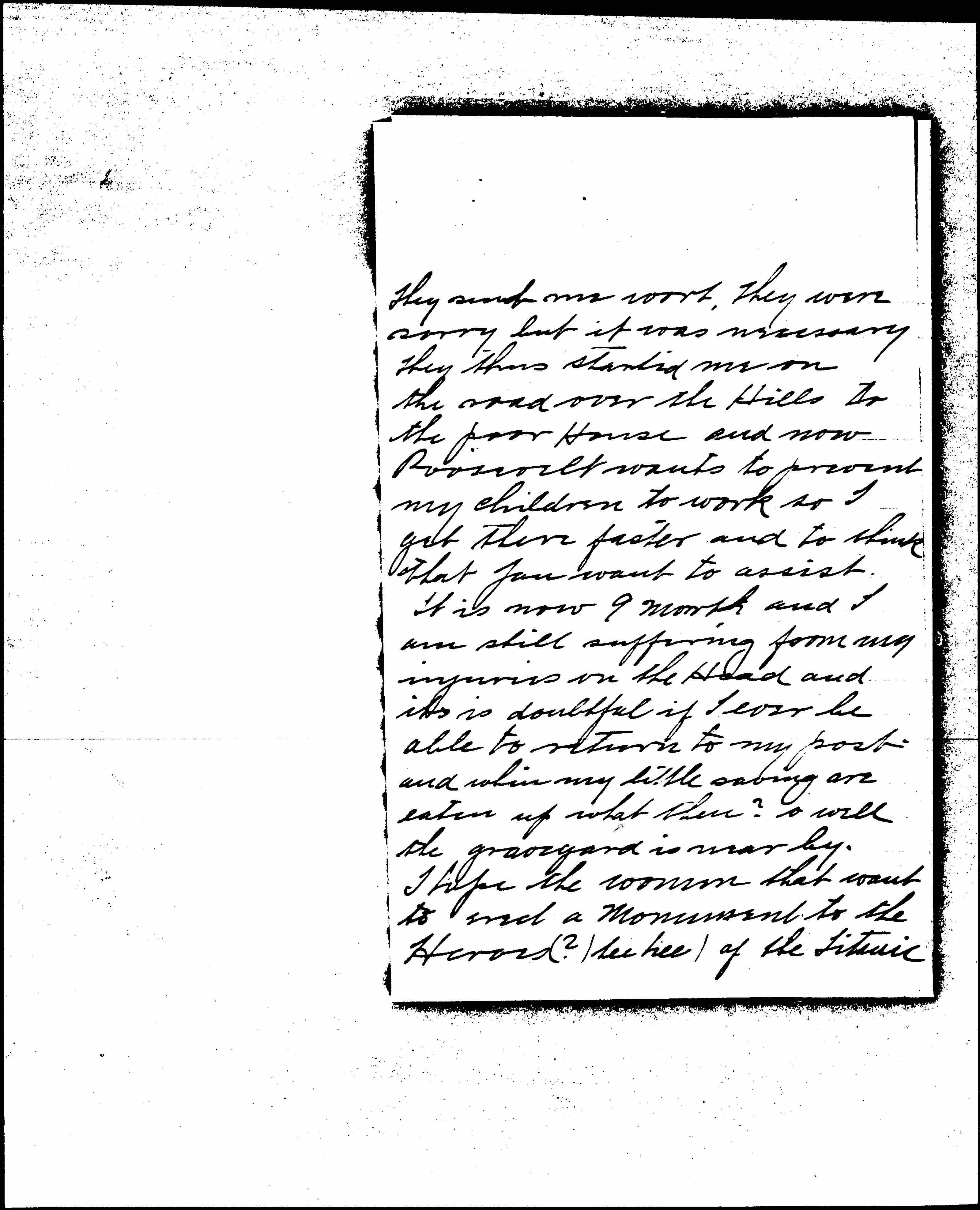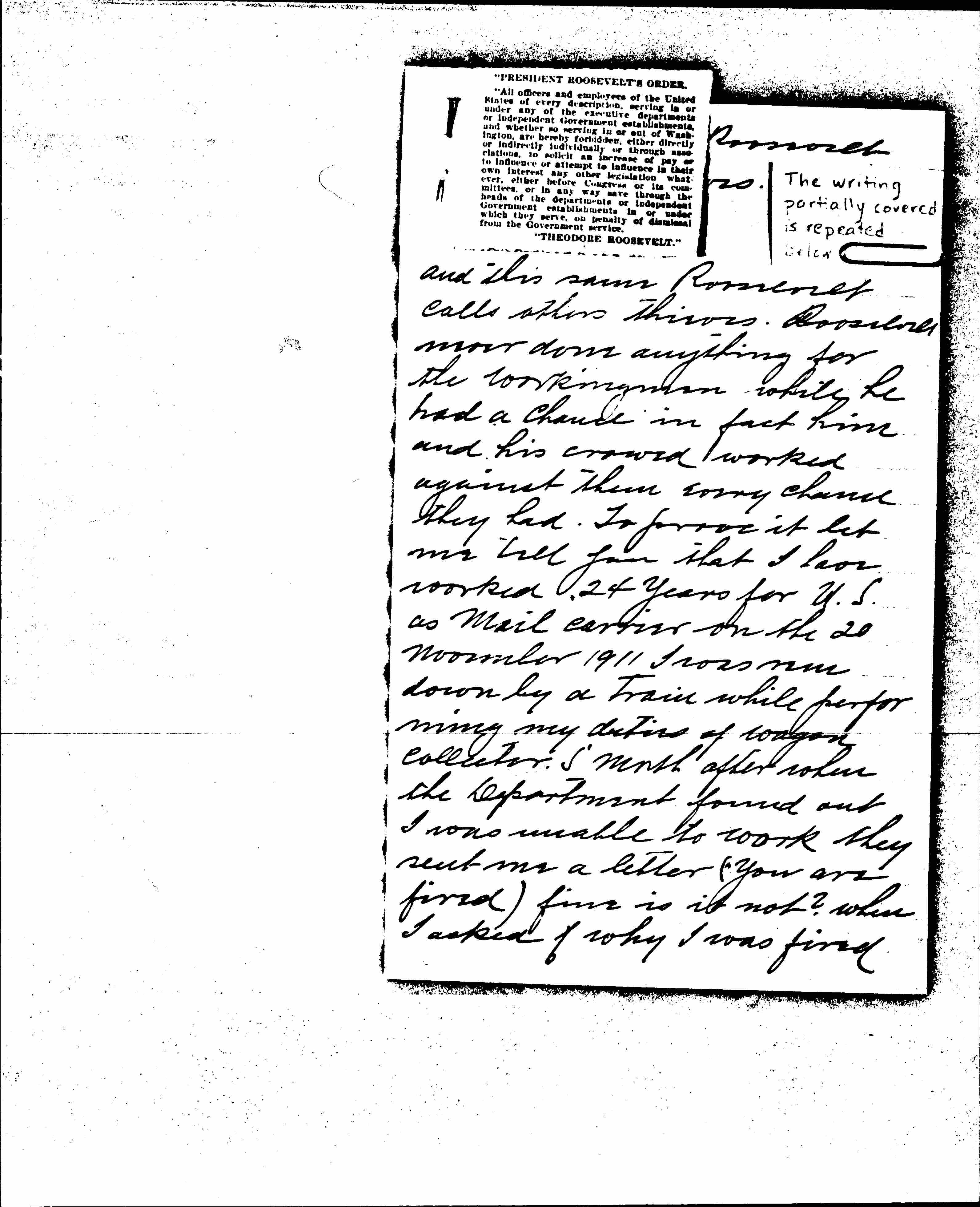 and this same Roosevelt calls others thieves. Roosevelt never does anything for the workingmen while he had a chance in fact him and his [crowd] worked against them every chance they had. To prove it let me tell you that I have worked 24 Years for U.S. as mail carrier on the 20 november 1911 I was run down by a train while performing my duties of wagon collector. [A] month after when the Department found out I was unable to work they sent me a letter ("you are fired") fine is it not? When I asked of why I was fired [page 4] They [sent] me [word], They were sorry but it was necessary. They then started me on the road over the Hills to the poor House and now Roosevelt wants to prevent my children to work so I get there faster and to think that you want to assist.