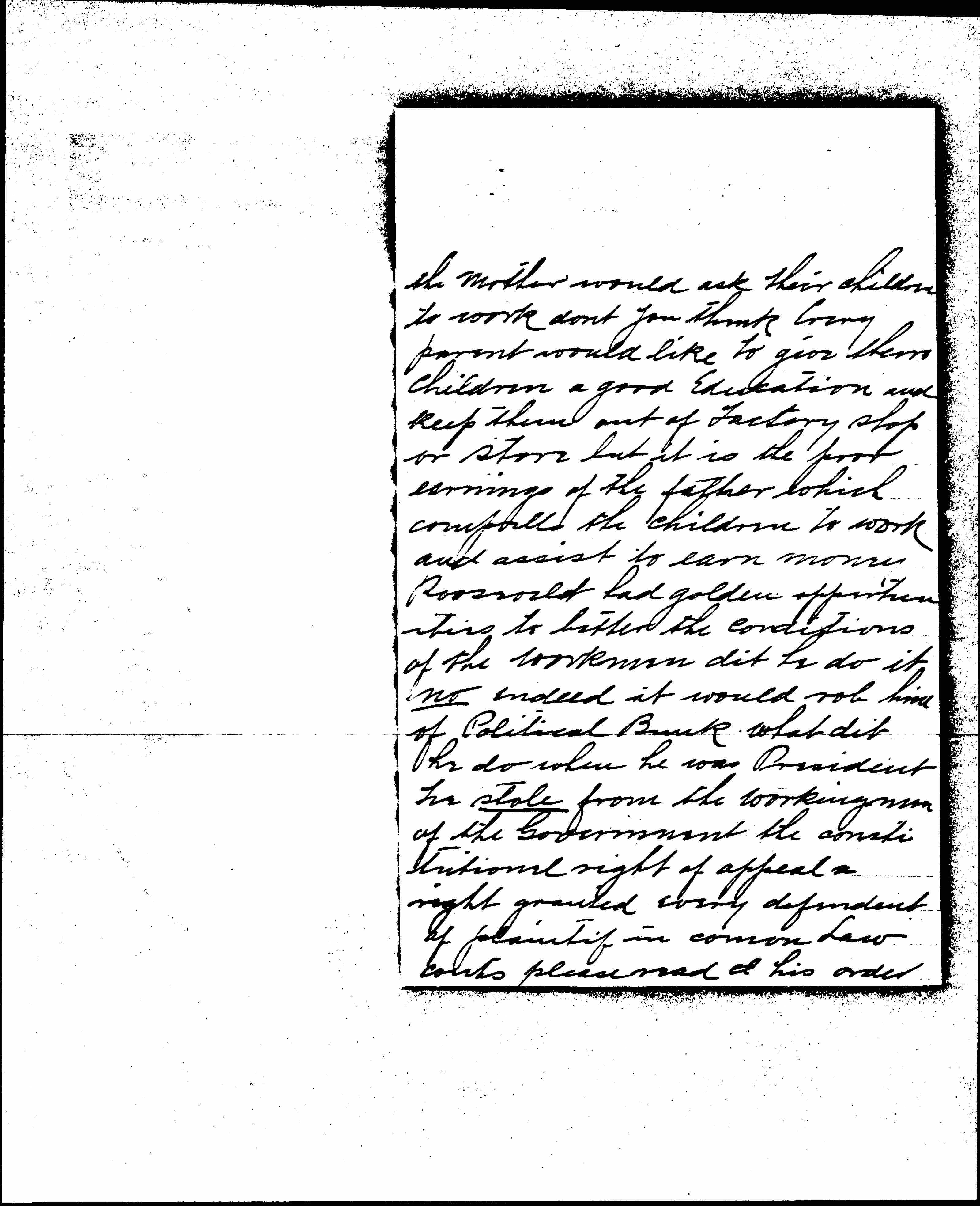 let me ask you did not Roosevelt [and] Taft last advocate the same principles years ago? or is the Human treatment of the [Families] of the Laborer a new light to them or Roosevelt in particular one would think so from all he reads and hears. In my estimation abolition of child labor can soon be accomplished if the Father would receive living wages he nor [page 2] the mother would ask their children to work don't you think loving parents would like to give their children a good education and keep them out of Factory shop or store but it is the poor earnings of the father which [compels] the children to work and assist to earn money. Roosevelt had golden opportunities to better the conditions of the workmen did he do it no indeed it would rob him of Political Bank what did he do when he was President he stole from the workingmen of the Government the constitutional right of appeal a right granted every defendant [and] [plaintiff] in [common] Law courts please read his order [page 3]