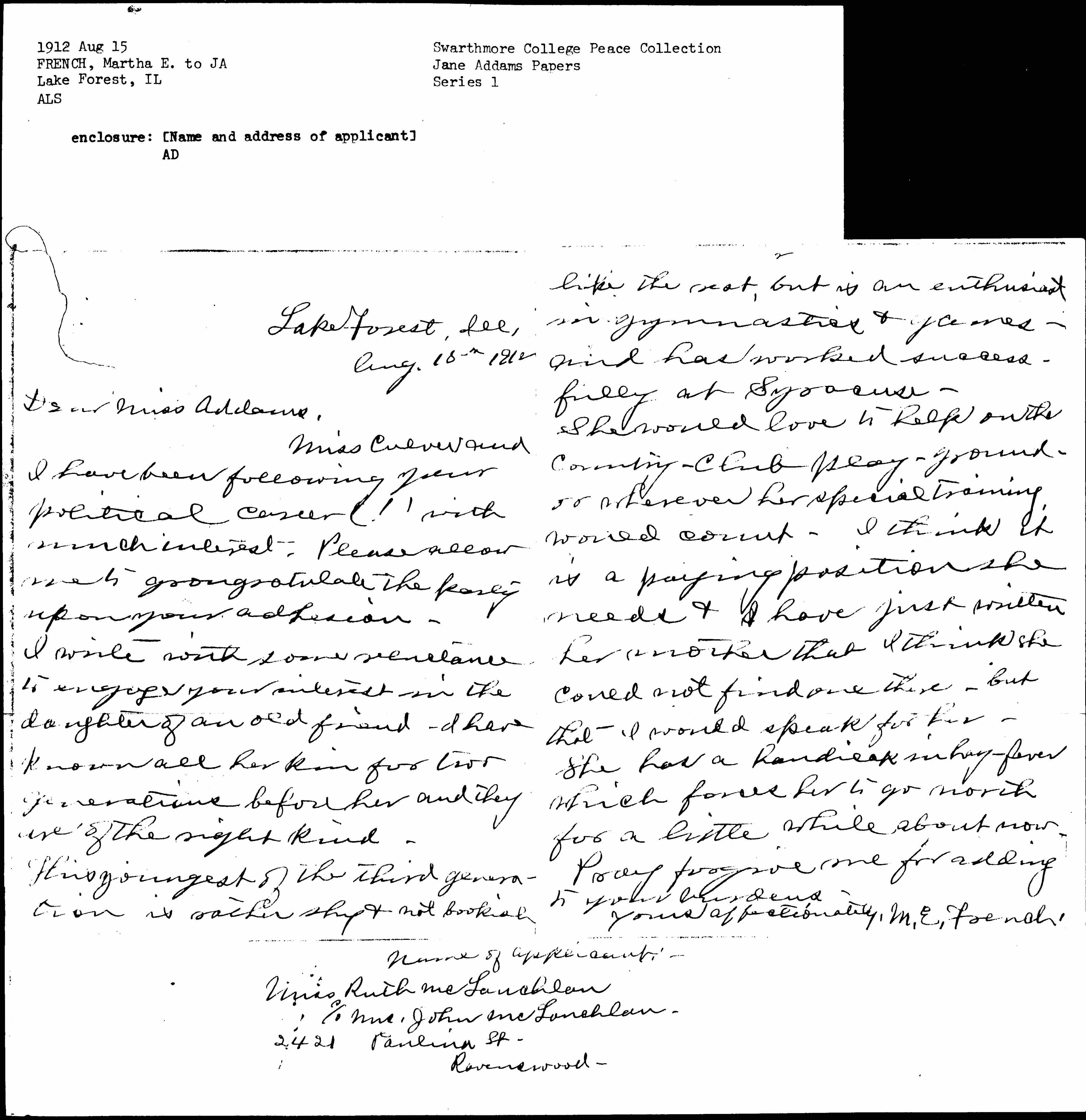 She would love to help on the country-club play-ground -- [to] wherever her special training would count. I think it is a paying position she needs & I have just written her mother that I think she could not find one there, but that I would speak for her. She has a handicap in hay-fever which forces her to go north for a little while about now. Pray forgive me for adding to your burdens.