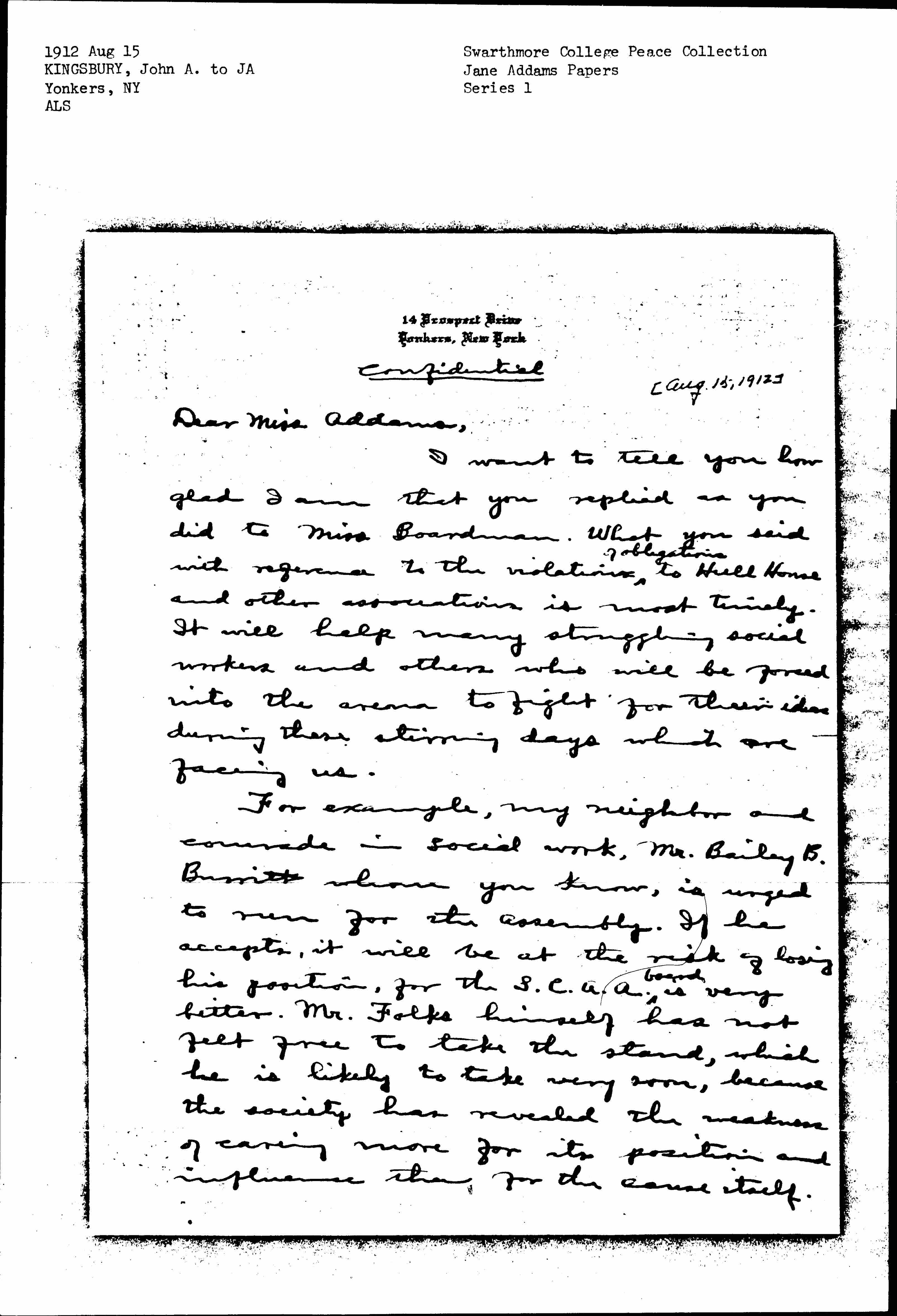I want to tell you how glad I am that you replied as you did to Miss Boardman. What you said with reference to the violations <of obligations> to Hull House and other associations is most timely. It will help many struggling social workers and others who will be forced into the arena to fight for their ideas during these stirring days which are facing us.