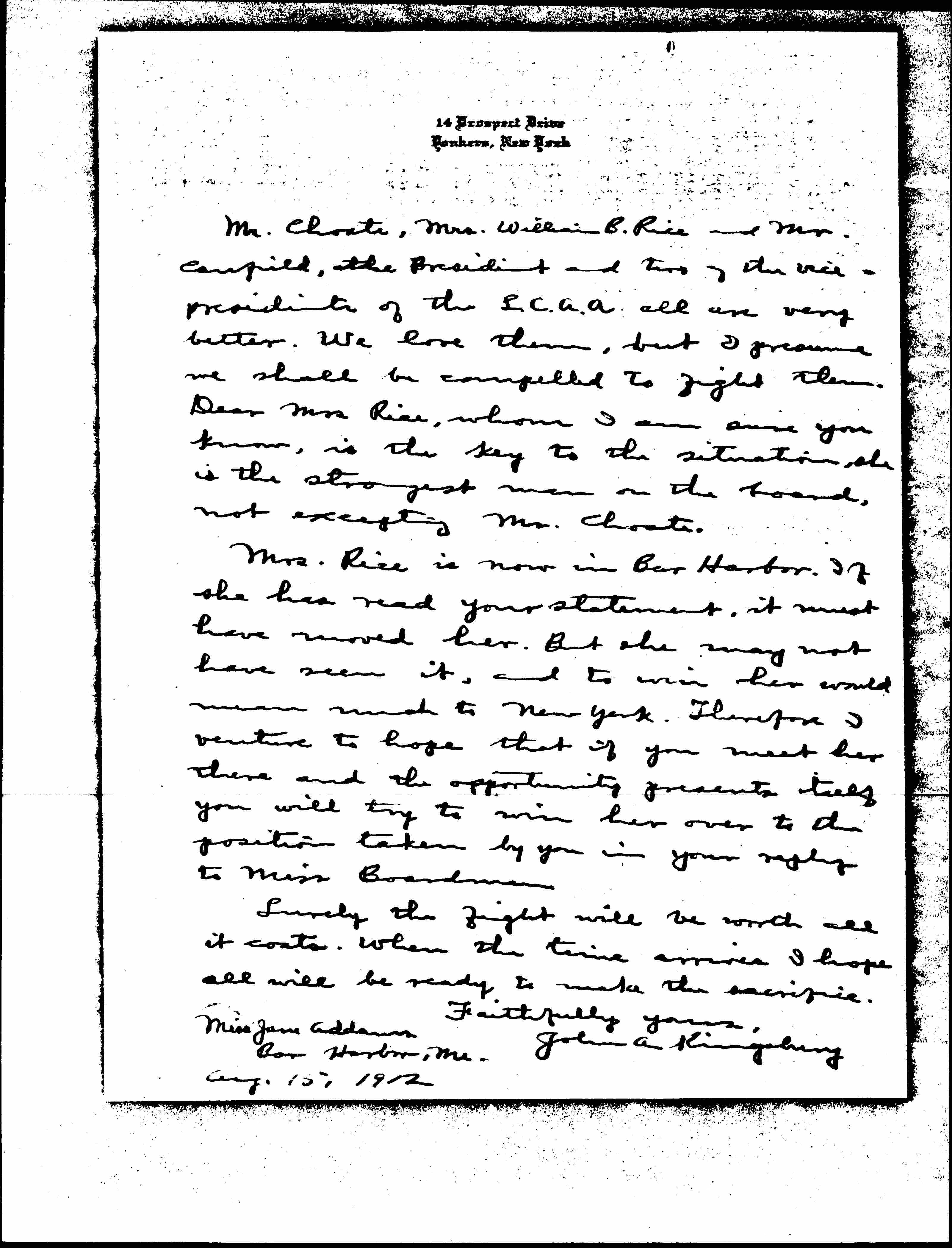 Mrs. Rice is now in Bar Harbor. If she has read your statement, it must have moved her. But she may not have seen it, and to win her would mean much to New York. Therefore I venture to hope that if you meet her there and the opportunity presents itself you will try to win her over to the position taken by you in your reply to Miss Boardman.
