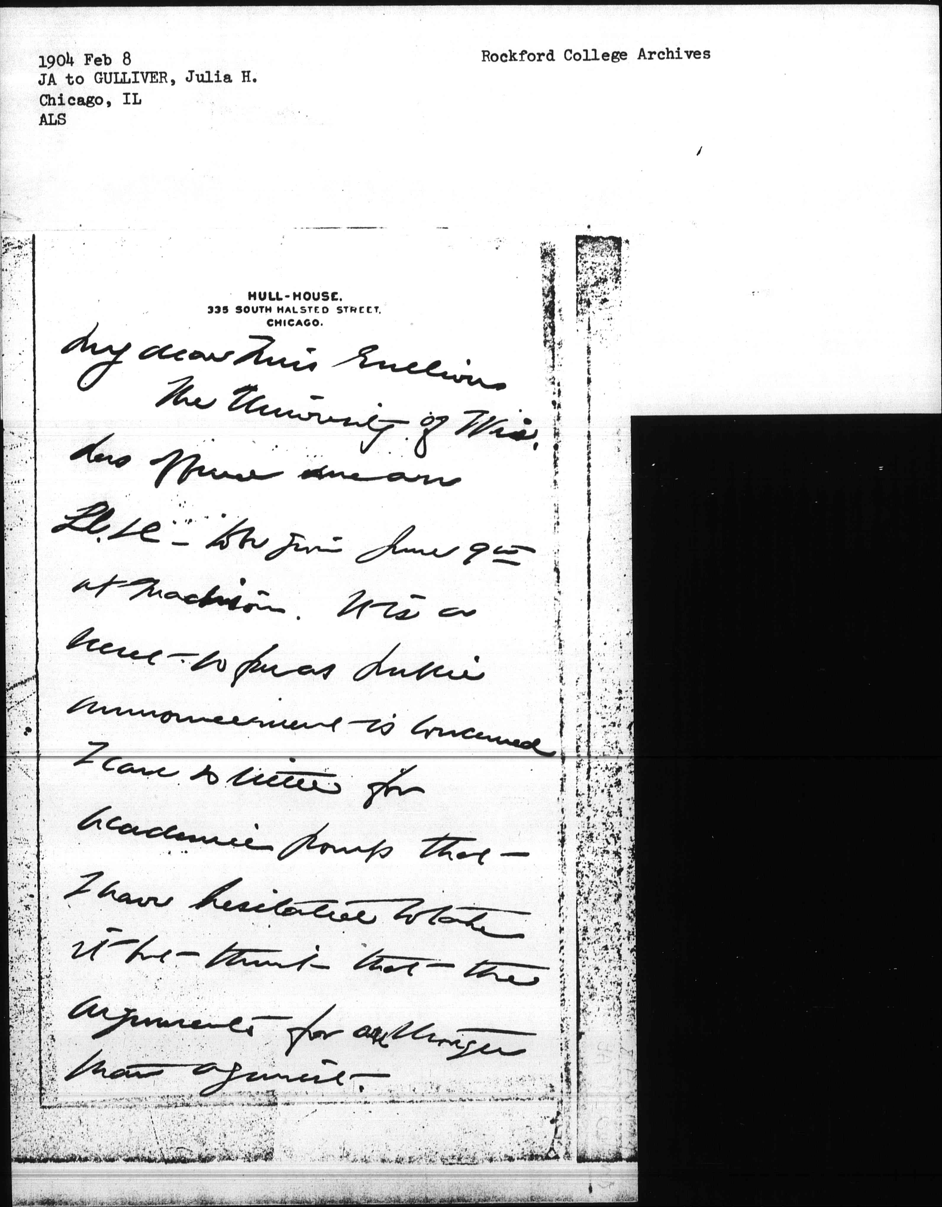 The University of Wis. has offered me an Ll.D. to be given June 9th at Madison. It is a secret so far as public announcement is concerned. I care so little for academic pomp that I have hesitated to take it but think that the arguments for are stronger than against. [page 2]