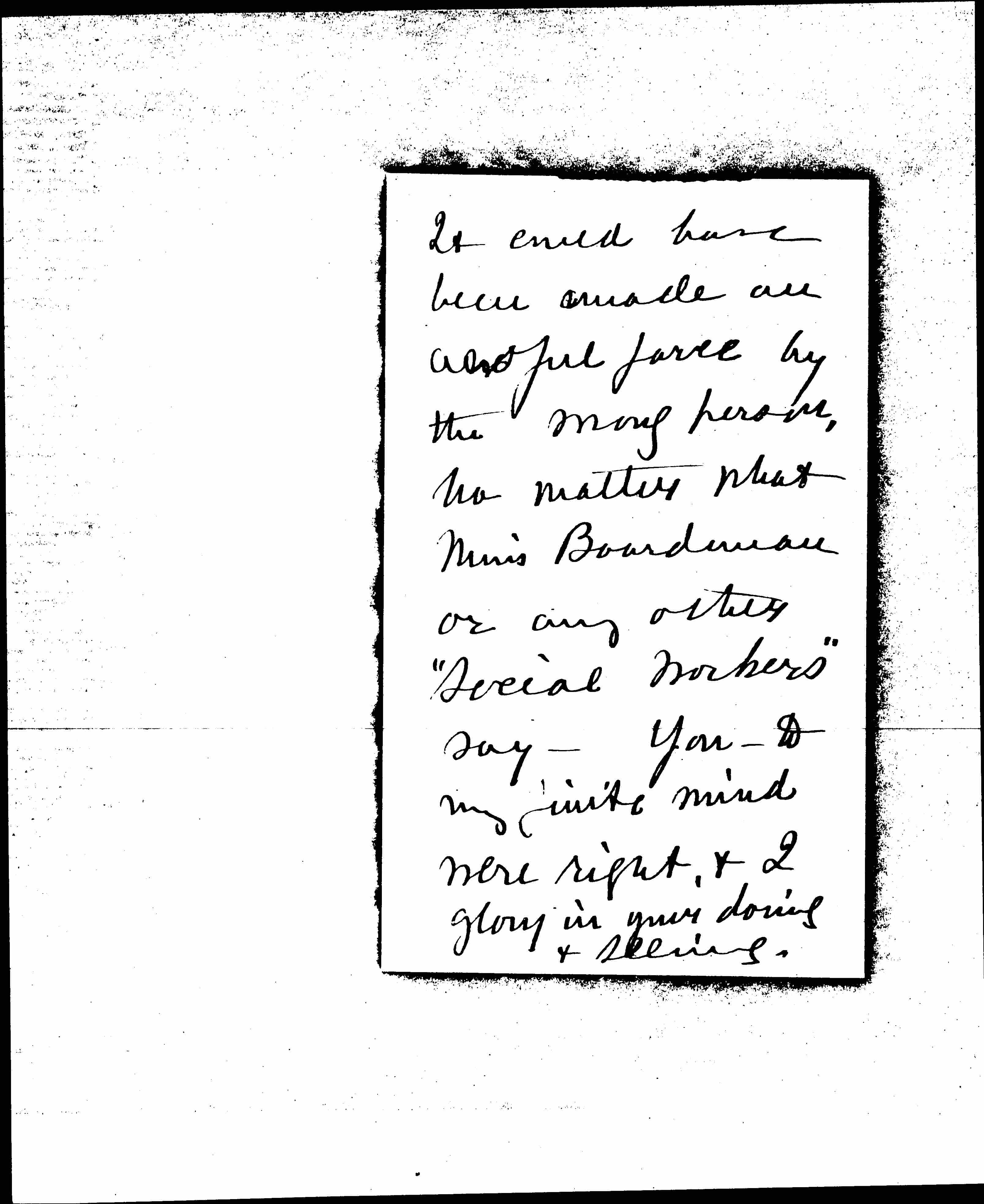 Someone, and the right one had to seize that moment when a new party was born -- and you and no one else was ready by experience and personality to do the deed, <and you did it perfectly, I think.> [page 4] It could have been made an awful farce by the wrong person, no matter what Miss Boardman or any other "Social Workers" say. You, to my finite mind were right, & I glory in your doing & seeing. [page 5] I cannot tell yet what I shall be able to do.