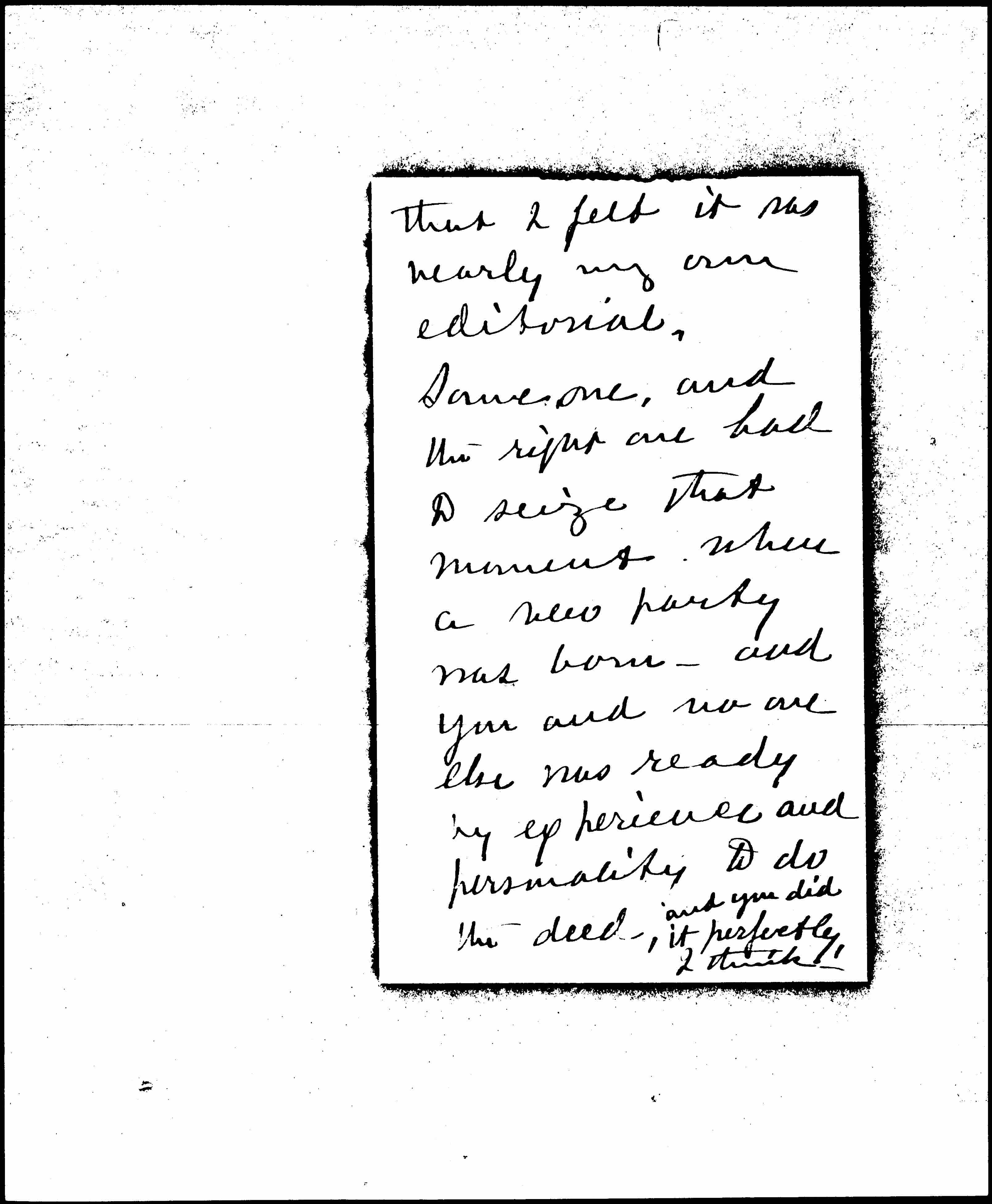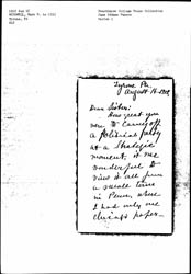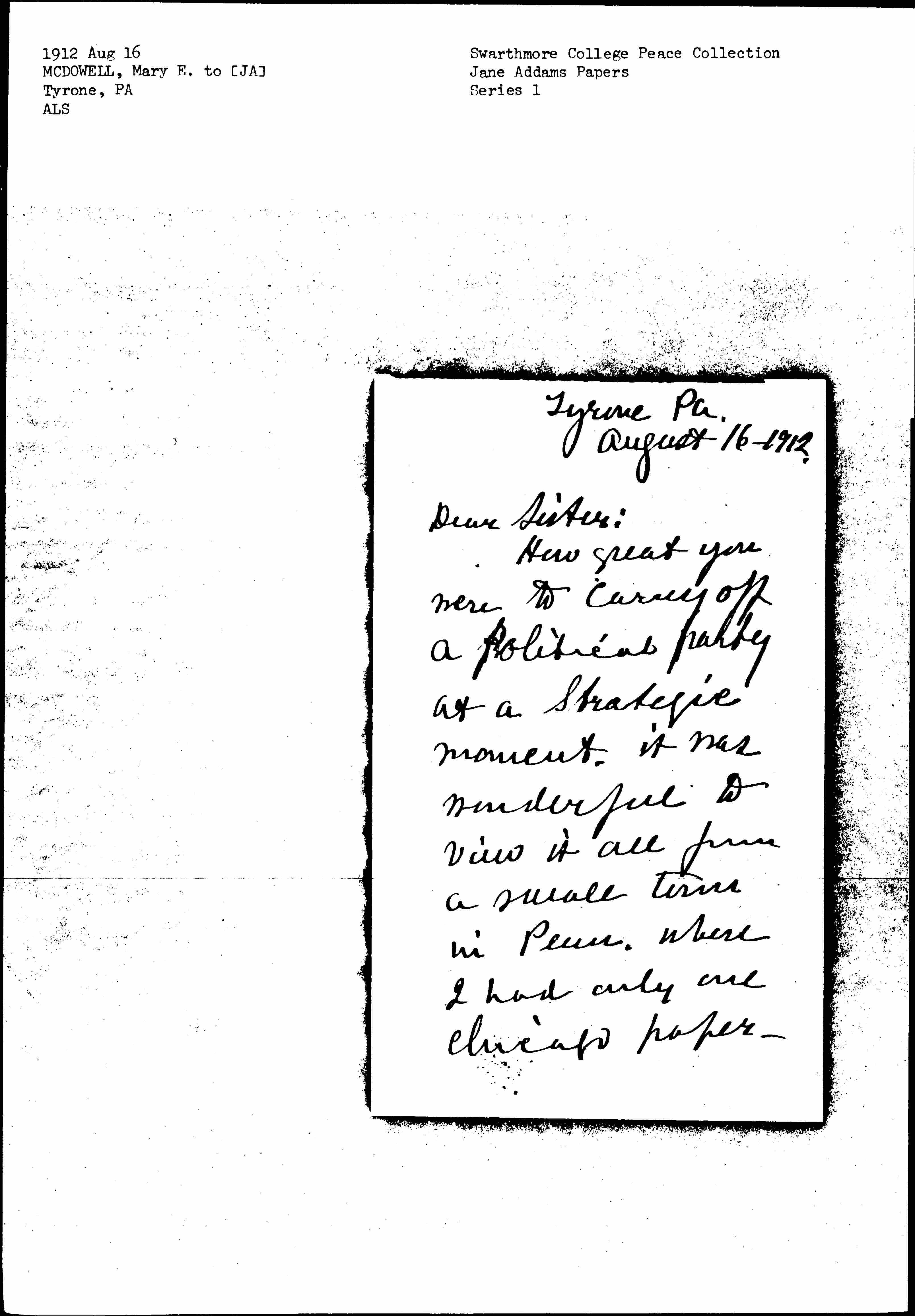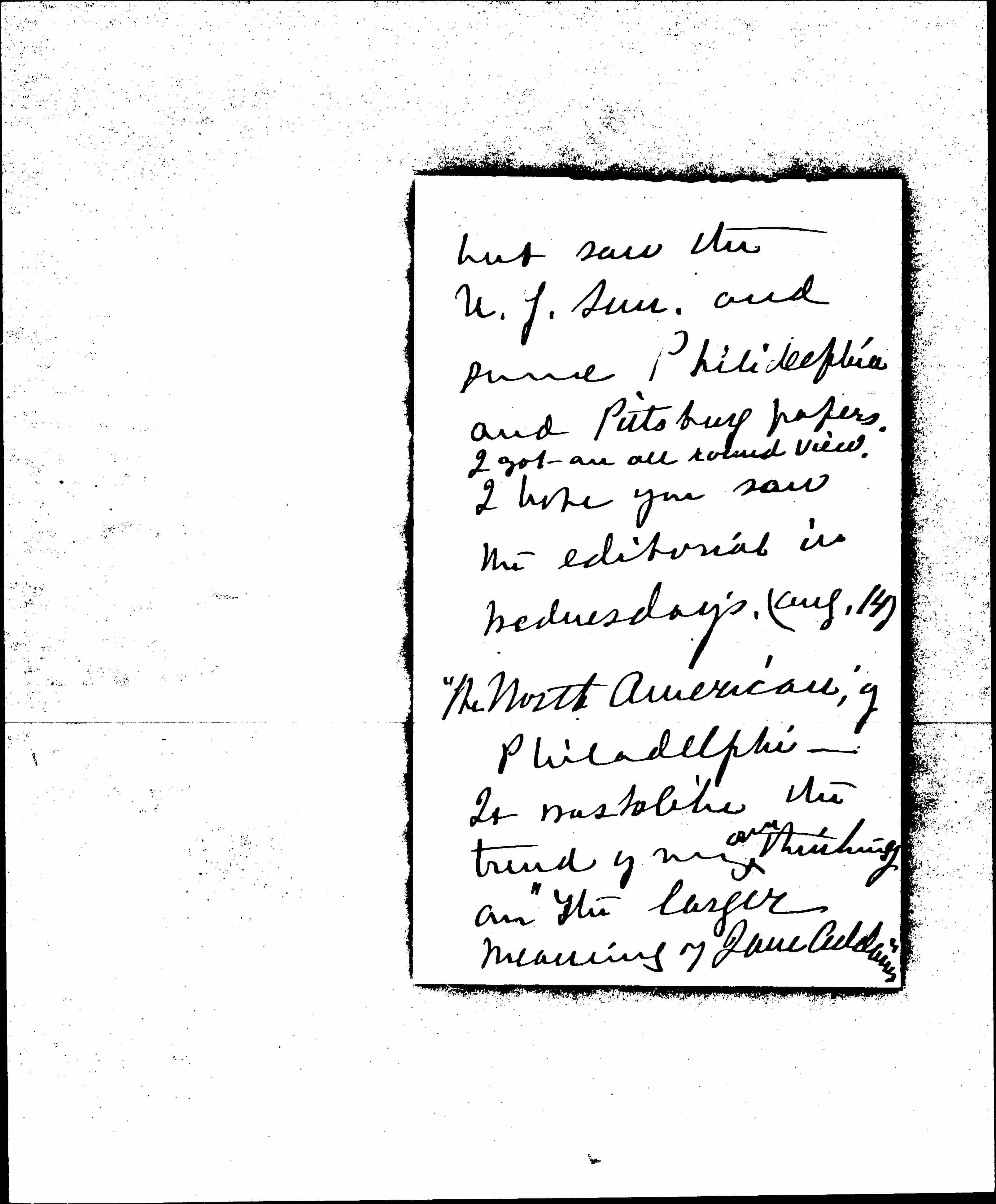 How great you were to carry off a political party at a Strategic moment, it was masterful to view it all from a small town in Penn. where I had only one Chicago paper -- [page 2] but saw the N.Y. Sun. and some Philadelphia and [Pittsburgh] papers. <I got an all round view.> I hope you saw the editorial in Wednesday's, (aug. 14) "The North American," of Philadelphia. It was so like the trend of my <own> thinking on "The larger meaning of Jane Addams" [page 3] that I felt it was nearly my own editorial.