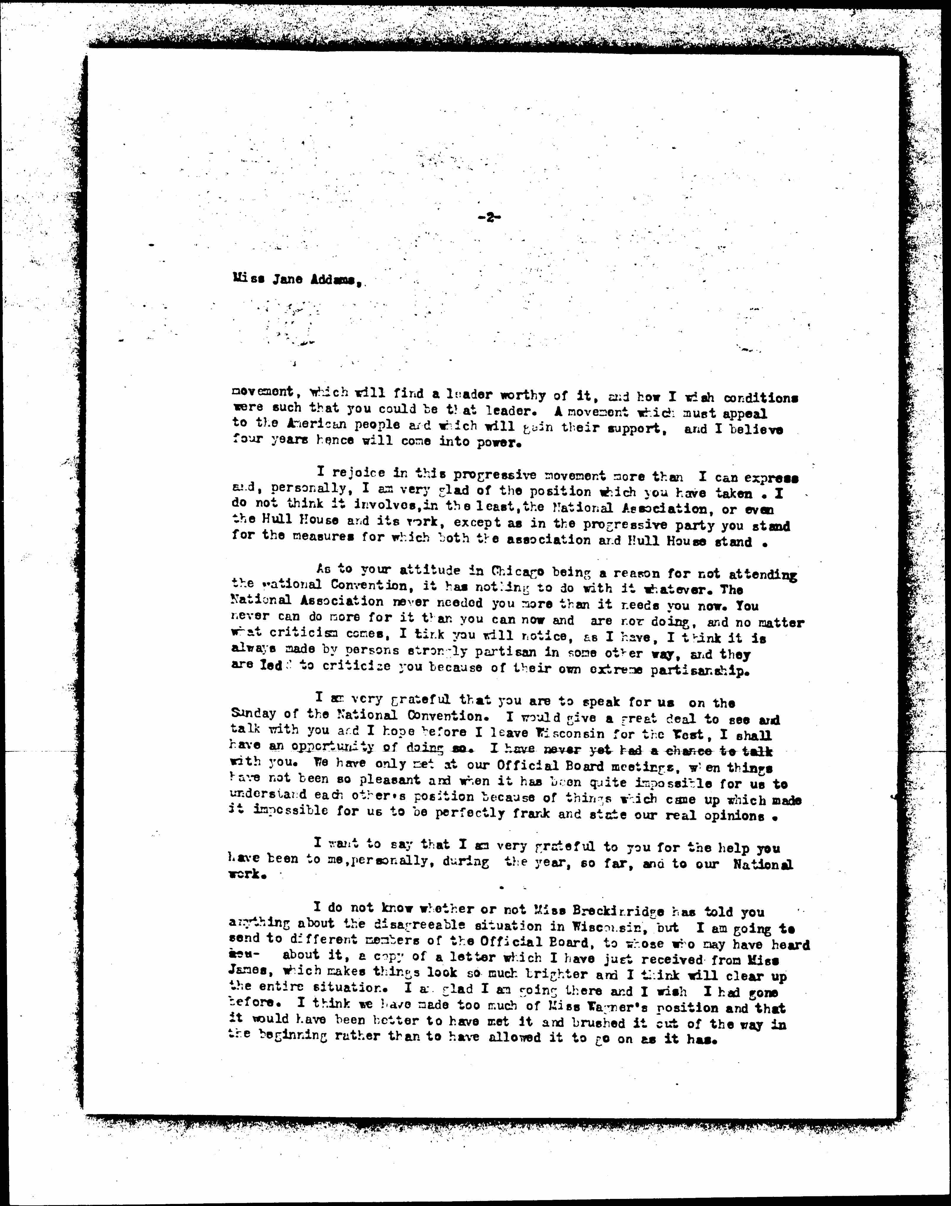 I rejoice in this progressive movement more than I can express and, personally, I am very glad of the position which you have taken. I do not think it involves, in the least, the National Association, or even the Hull House and its work, except as in the progressive party you stand for the measures for which both the association and Hull House stand.