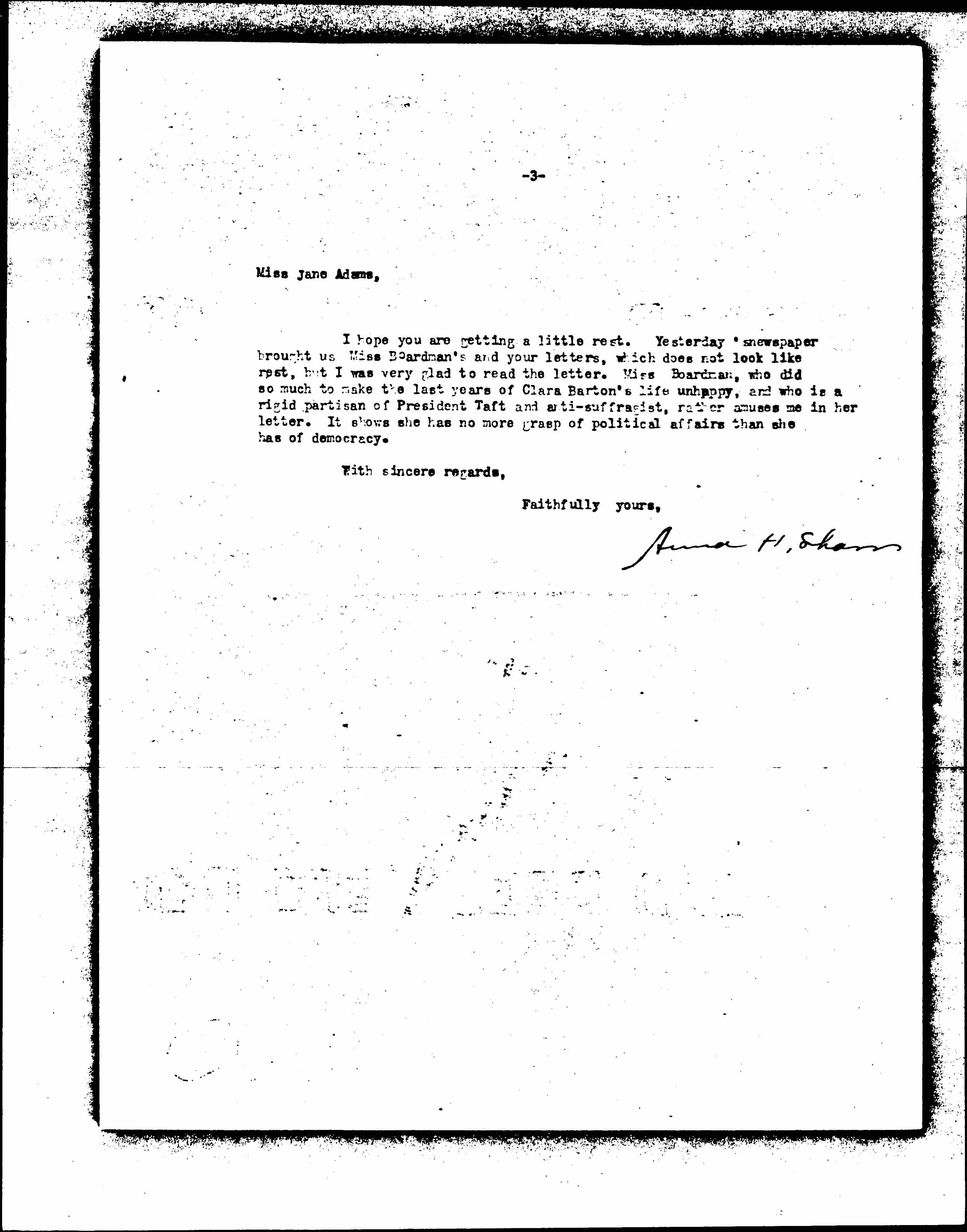 I hope you are getting a little rest. Yesterday's newspaper brought us Miss Boardman's and your letters, which does not look like rest, but I was very glad to read the letter. Miss Boardman, who did so much to make the last years of Clara Barton's life unhappy, and who is a rigid partisan of President Taft and anti-suffragist, rather amuses me in her letter. It shows she has no more grasp of political affairs than she has of democracy.