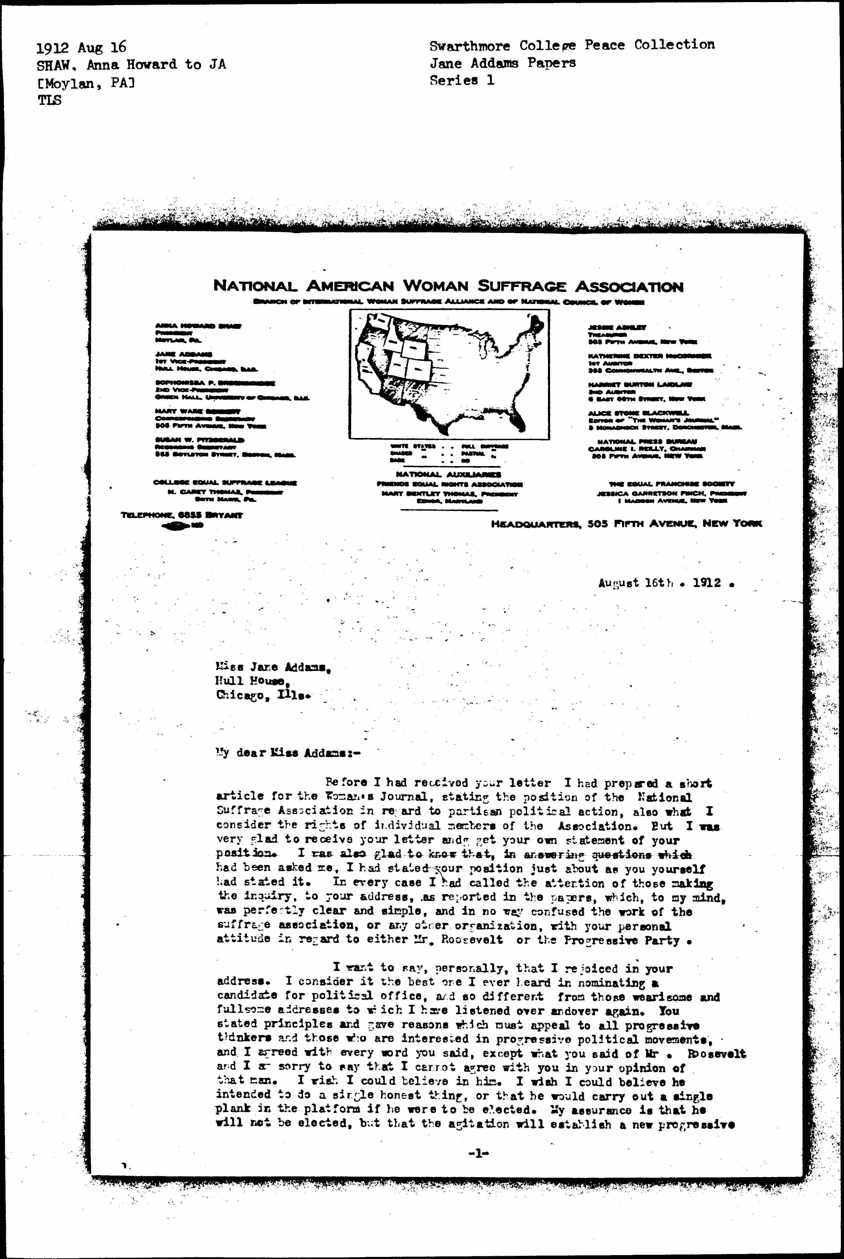 Before I had received your letter I had prepared a short article for the Woman's Journal, stating the position of the National Suffrage Association in regard to partisan political action, also what I consider the rights of individual members of the Association. But I was very glad to receive your letter and get your own statement of your position. I was also glad to know that, in answering questions which had been asked me, I had stated your position just about as you yourself had stated it. In every case I had called the attention of those making the inquiry, to your address, as reported in the papers, which, to my mind, was perfectly clear and simple, and in no way confused the work of the suffrage association, or any other organization, with your personal attitude in regard to either Mr. Roosevelt or the Progressive Party.