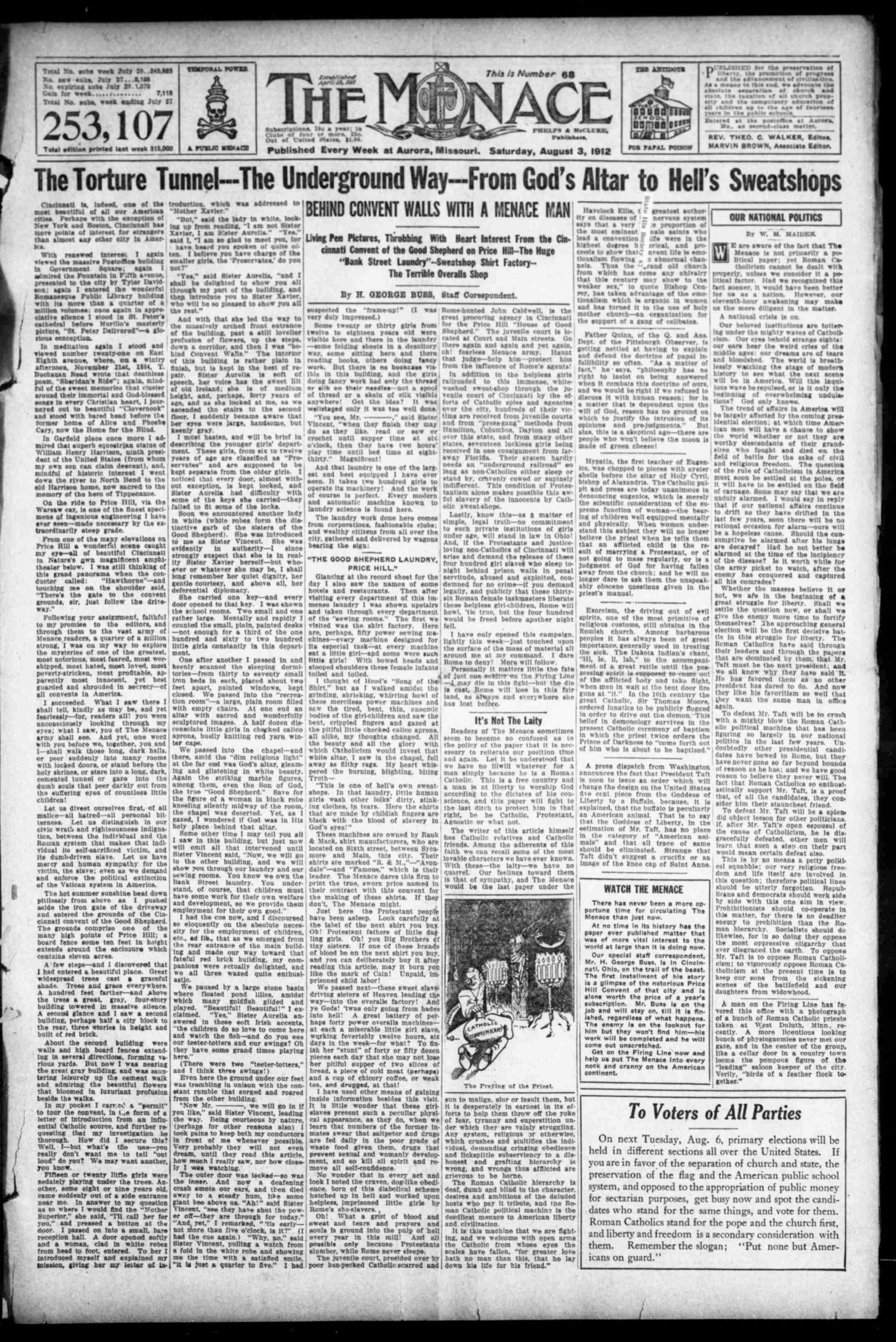 This is by no means a petty political squabble; our very religious freedom and life itself are involved in this question; therefore political lines should be utterly forgotten. Republicans and democrats should work side by side with this one aim in view. Prohibitionists should cooperate in this matter, for there is no deadlier enemy to prohibition than the Roman hierarchy. Socialists should do likewise, for in so doing they oppose their most oppressive oligarchy that ever disgraced the earth. To oppose Mr. Taft is to oppose Roman Catholicism; to vigorously oppose Roman Catholicism at the present time is to keep our sons from the sickening scenes of the battlefield and our daughters from widowhood.