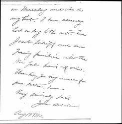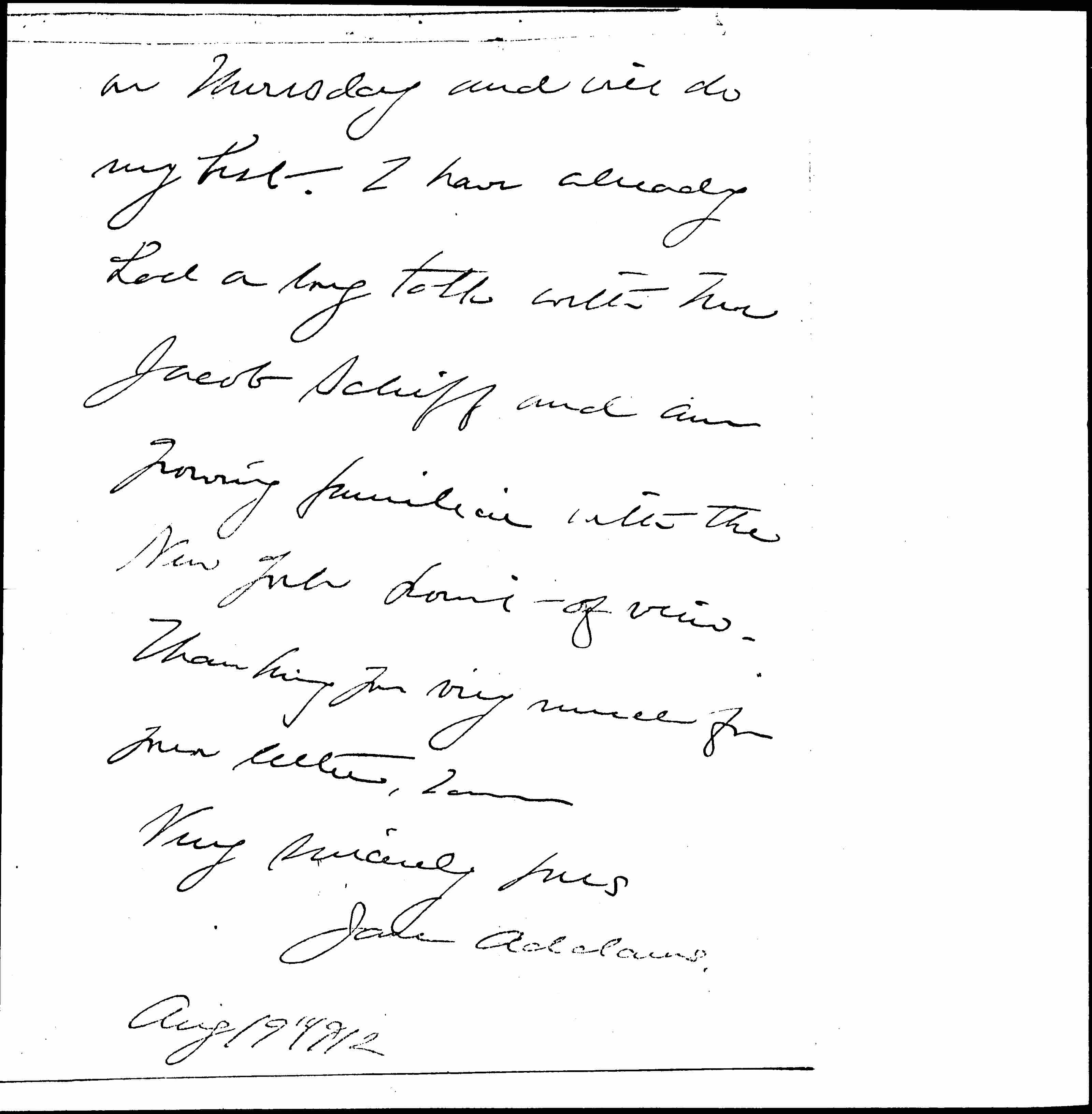 I lunch at her house [page 2] on Thursday and will do my best. I have already had a long talk with Mr Jacob Schiff and am growing familiar with the New York point of view. Thanking you very much for your letter, I am