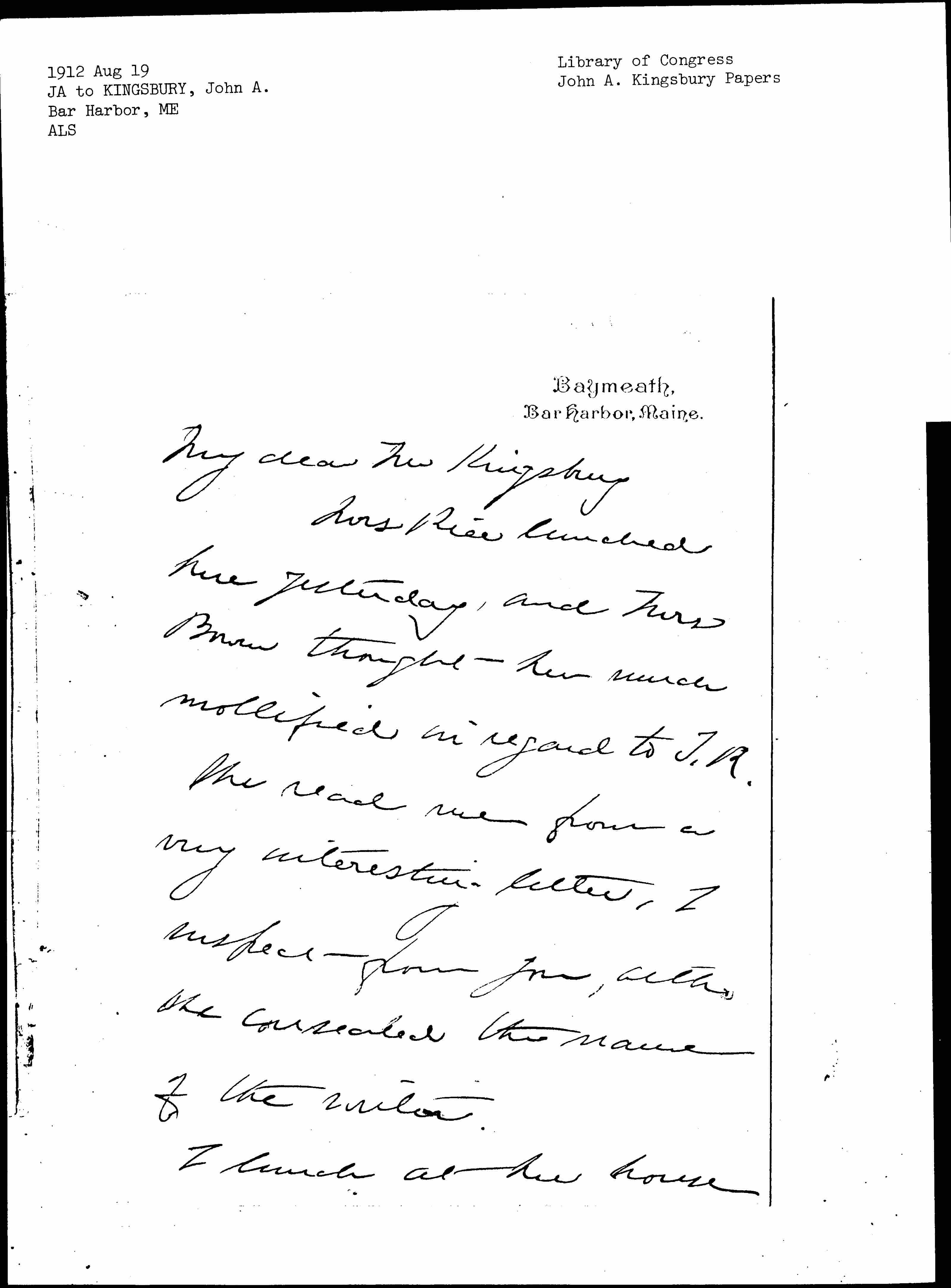 Mrs Rice lunched here yesterday, and Mrs Bowen thought her much mollified in regard to T. R.