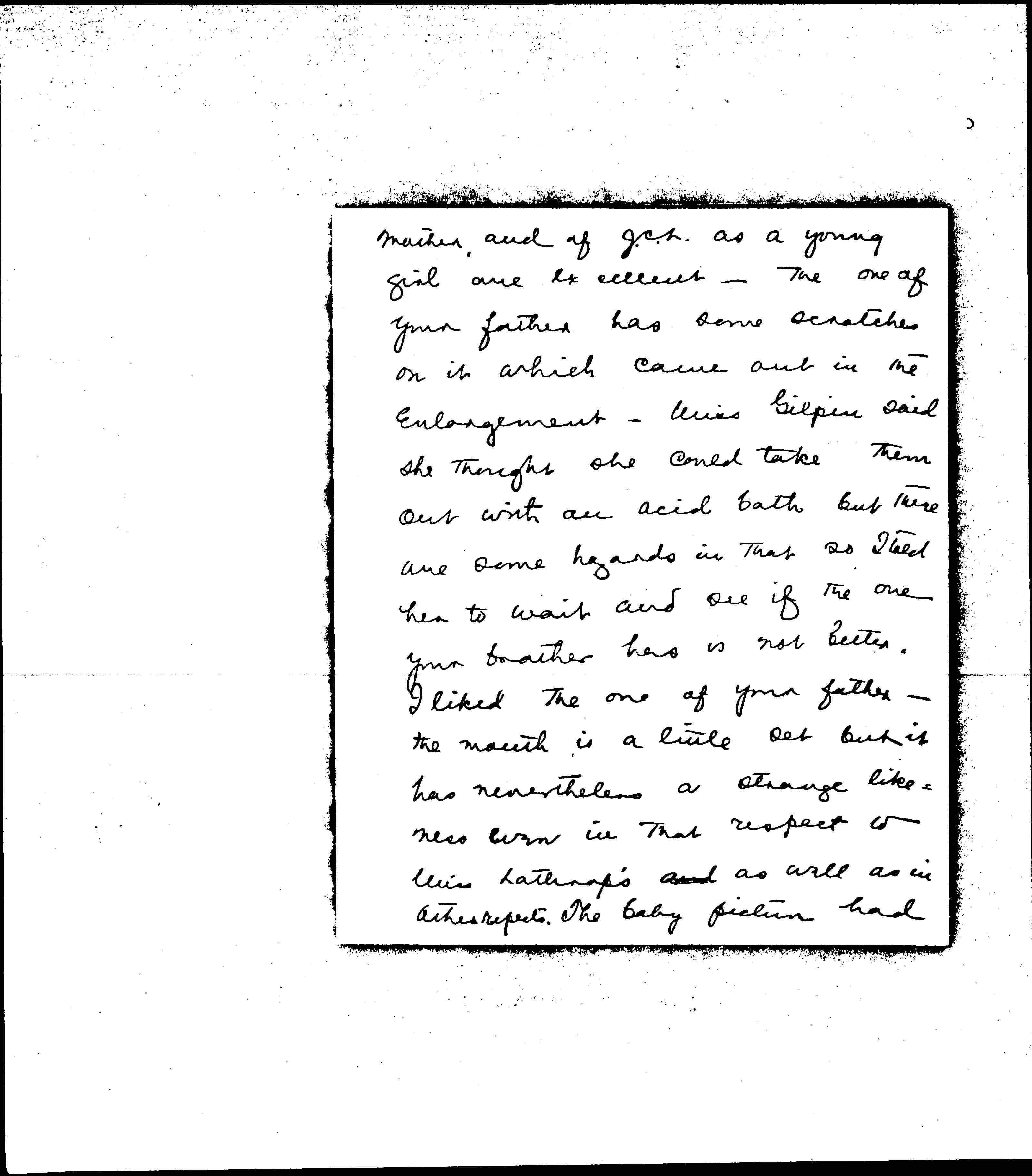 Miss Gilpin will send the pictures and return the ones you left after we hear from you about your father's picture. If you are not sending another one, we had better subject this one to the acid bath.