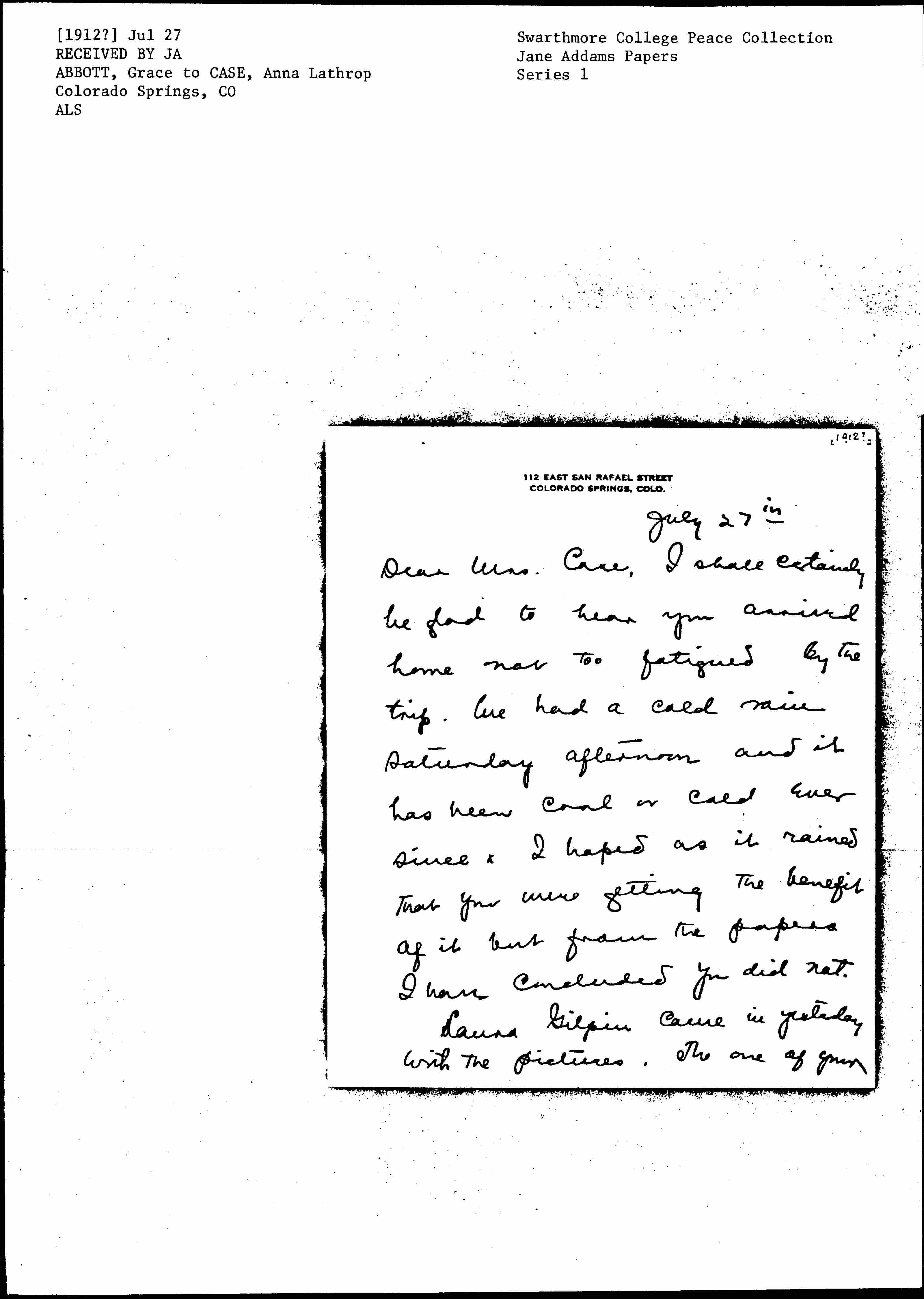 Dear Mrs. Case, I shall certainly be glad to hear you arrived home not too fatigued by the trip. We had a cold rain Saturday afternoon and it has been cool or cold ever since & I hoped as it rained that you were getting the benefit of it but from the papers I have concluded you did not.