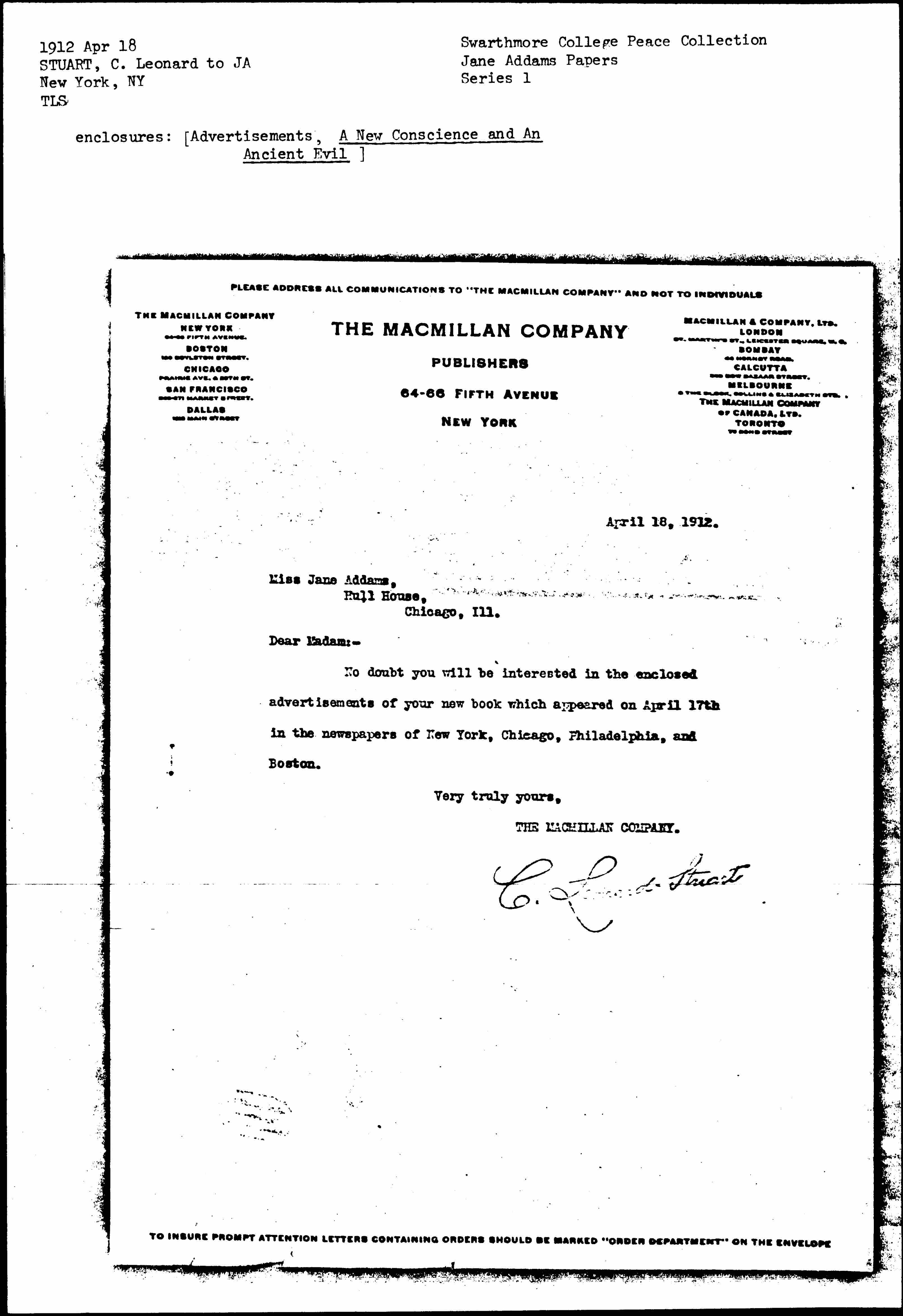 No doubt you will be interested in the enclosed advertisements of your new book which appeared on April 17th in the newspapers of New York, Chicago, Philadelphia, and Boston.