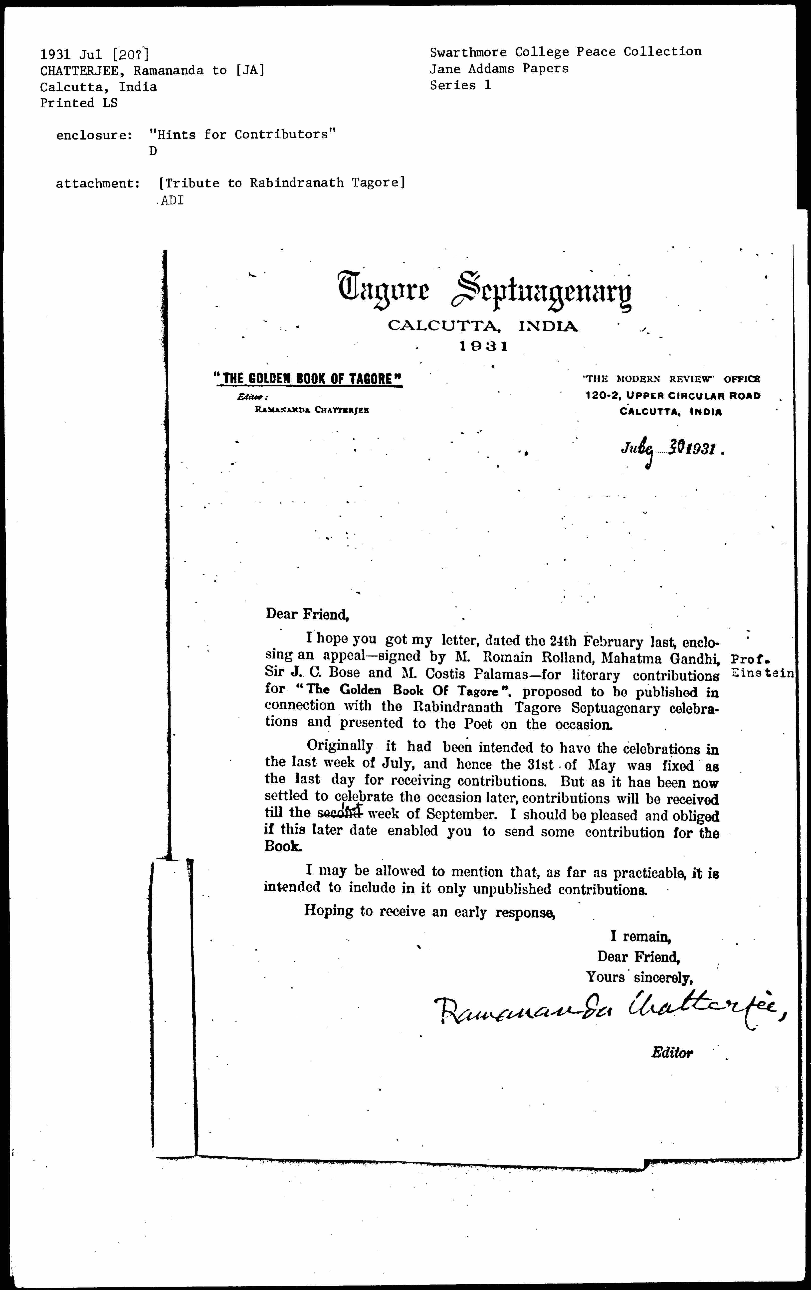 Ramananda Chatterjee to Jane Addams, ca. July 20, 1931