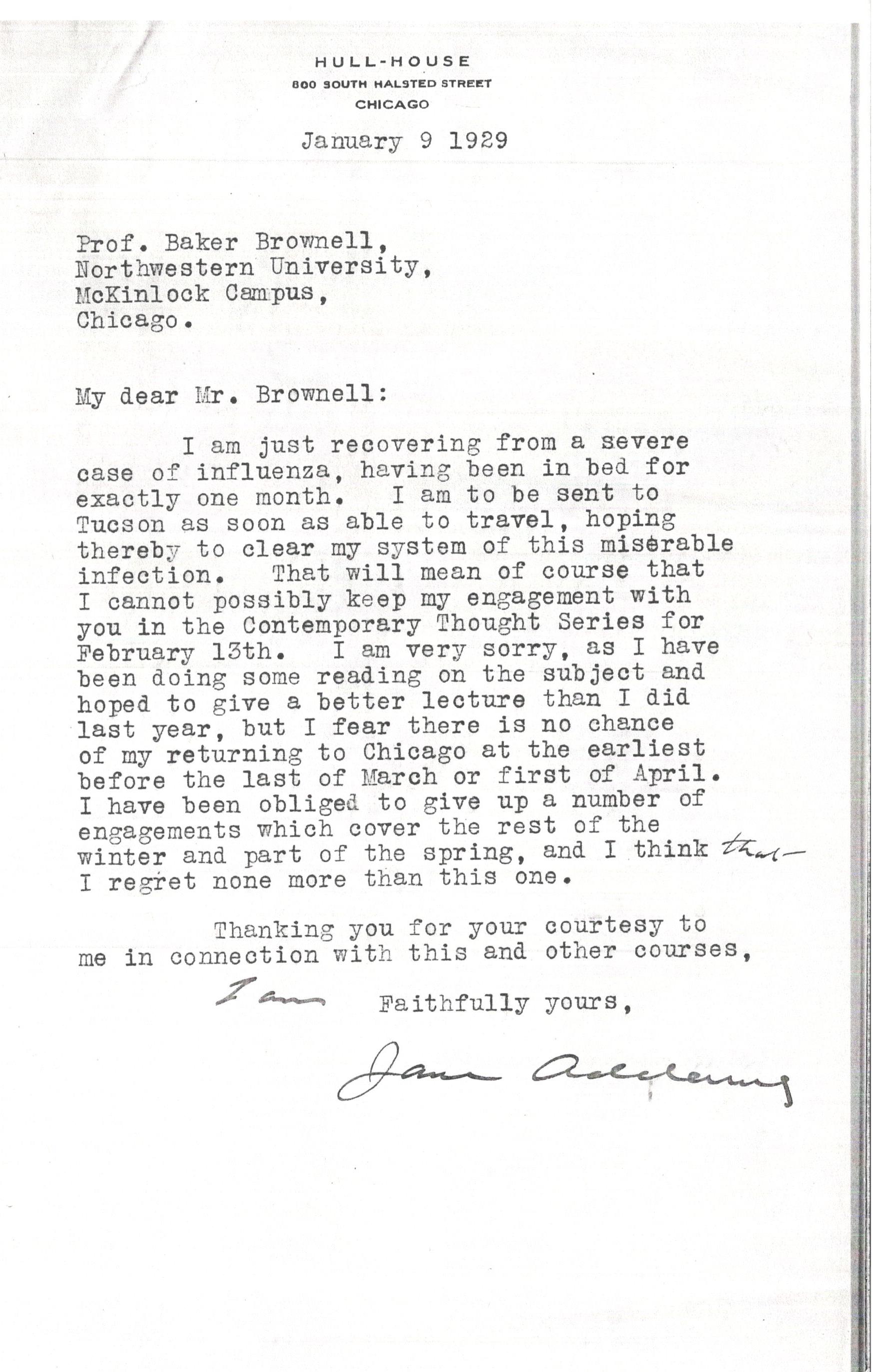 Jane Addams to Baker Brownell, January 9, 1929