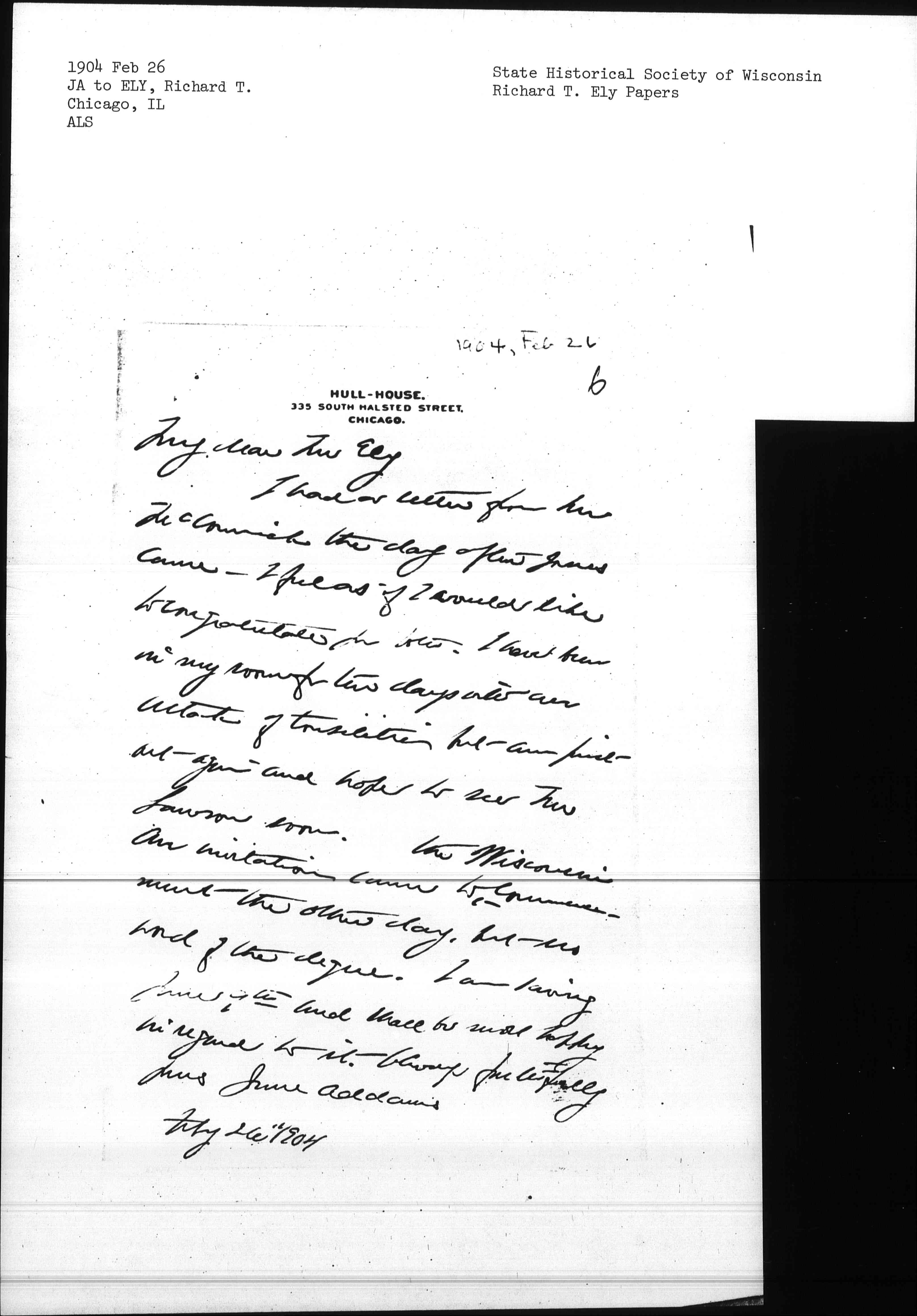 I had a letter from Mr McCormick the day after yours came. I feel as if I would like to congratulate you both. I have been in my room for ten days with an attack of [tonsillitis] but am just out again and hope to see Mr Lawson soon. An invitation came to <the Wisconsin> commencement the other day, but no word of the degree. I am leaving June 9th and shall be [most] happy in regard to it. Always faithfully yours Jane Addams