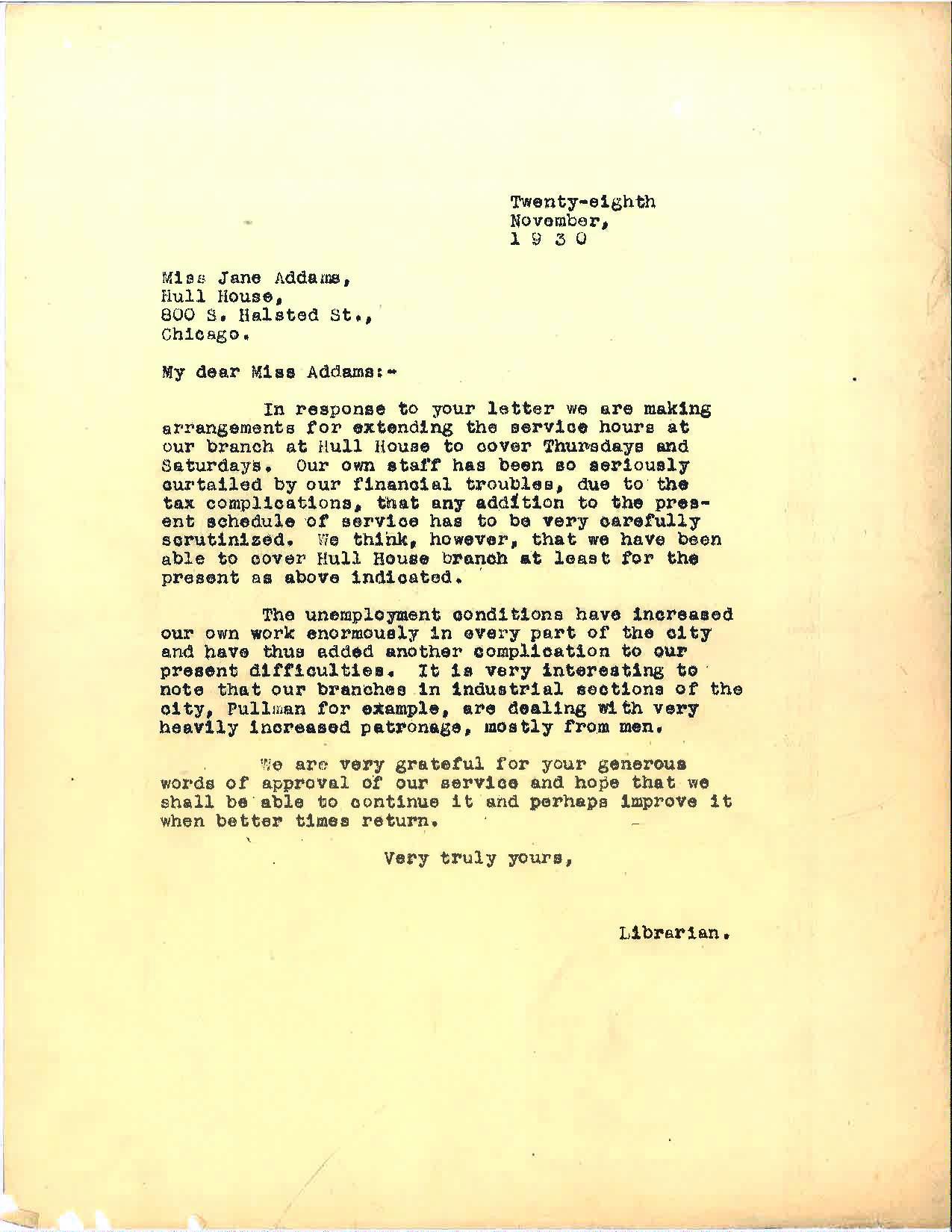Carl Bismarck Roden to Jane Addams, November 28, 1930