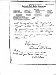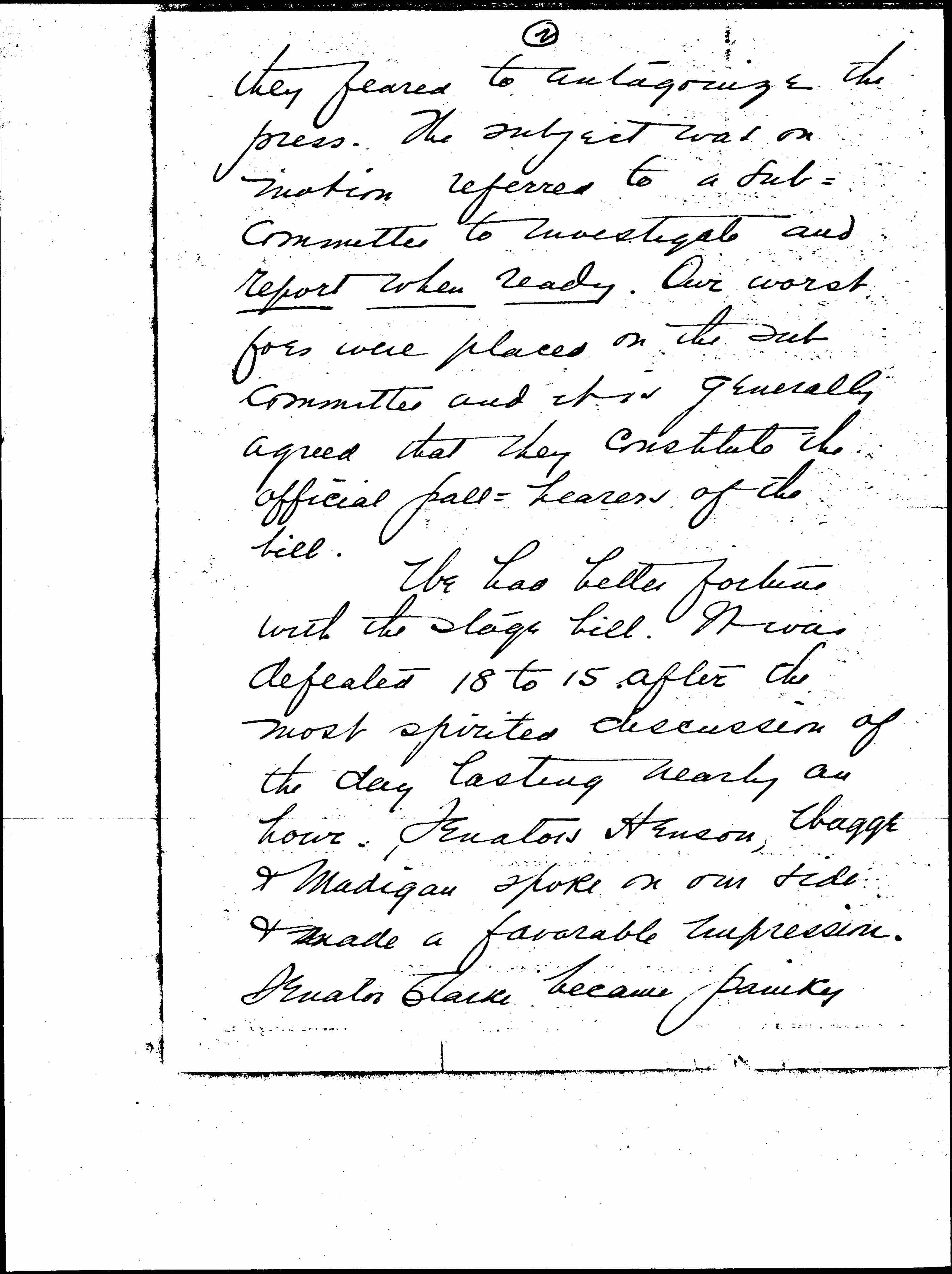 We had better fortune with the stage bill. It was defeated 18 to 15 after the most spirited discussion of the day lasting nearly an hour. Senators Henson, Chagge & Madigan spoke on our side & made a favorable impression. Senator Clarke became [panicky] [page 3] and enraged at his defeat & served notice to the Senate that he would move to reconsider the bill tomorrow. We therefore wired you for pressure from your end.