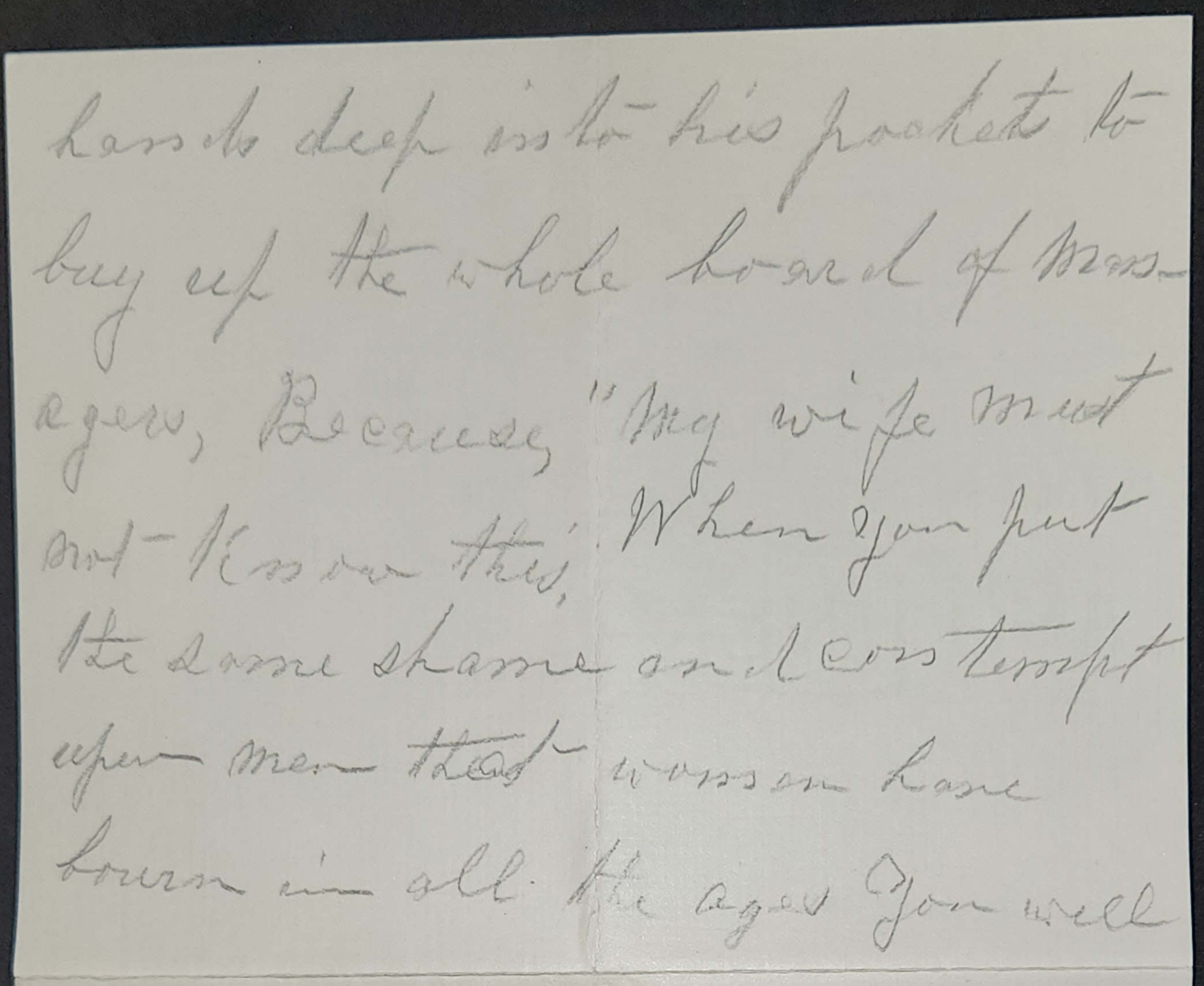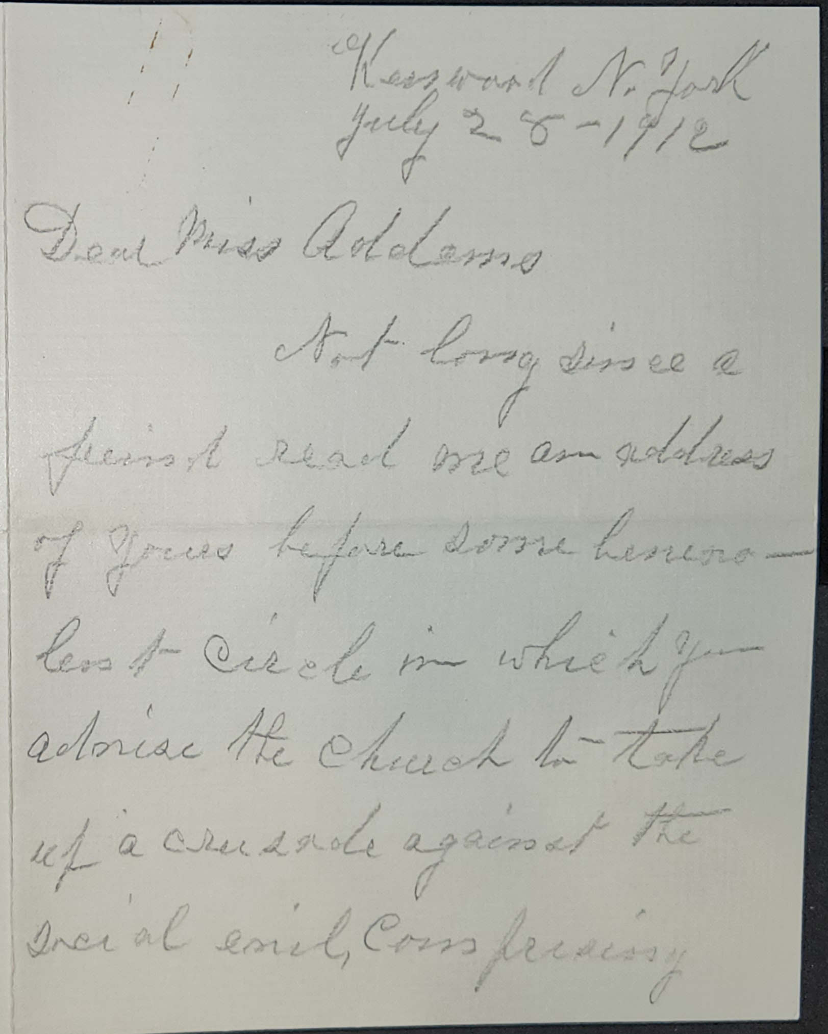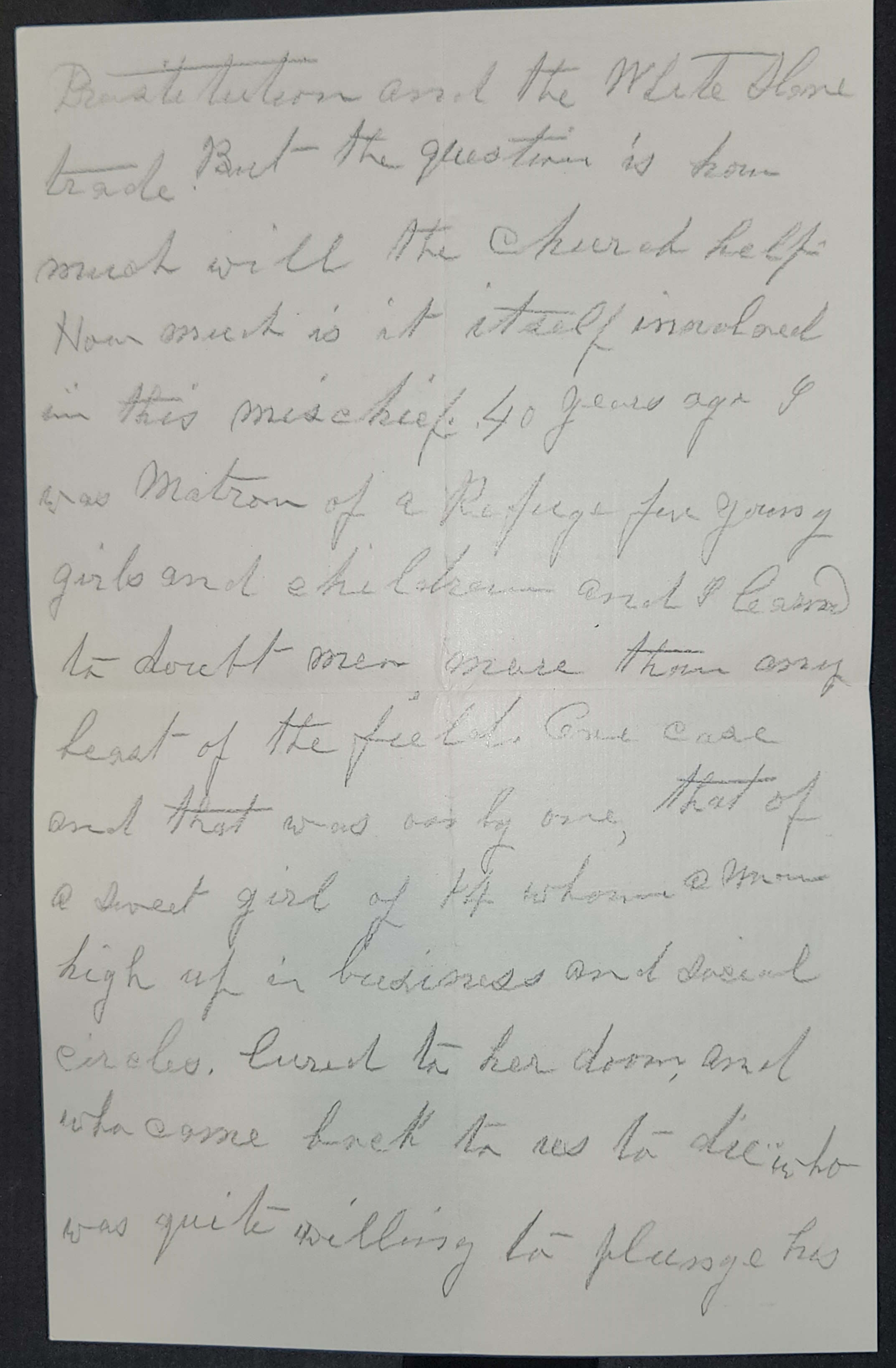 Not long since a friend read me an address of yours before some [illegible] circle -- in which you advise the church to take up a crusade against the social evil, comprising [page 2] Prostitution and the White Slave trade. But the question is how much will the church help. How much is it itself involved in this mischief. 40 years ago I was Matron of a Refuge for young girls and children and I learned to doubt men more than any beast of the field. One case and that was only one, that of a sweet girl of 14 when a man high up in business and social circles lured to her doom, and who came back to us to die who was quite willing to plunge his [page 3] hands deep into his pockets to buy up the whole board of managers, Because, "My wife must not know this." When you put the same shame and contempt upon men that women have [borne] in all the ages you will [page 4] have gone far to cure the evil.