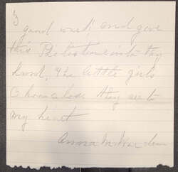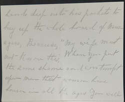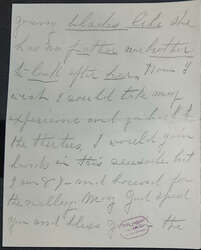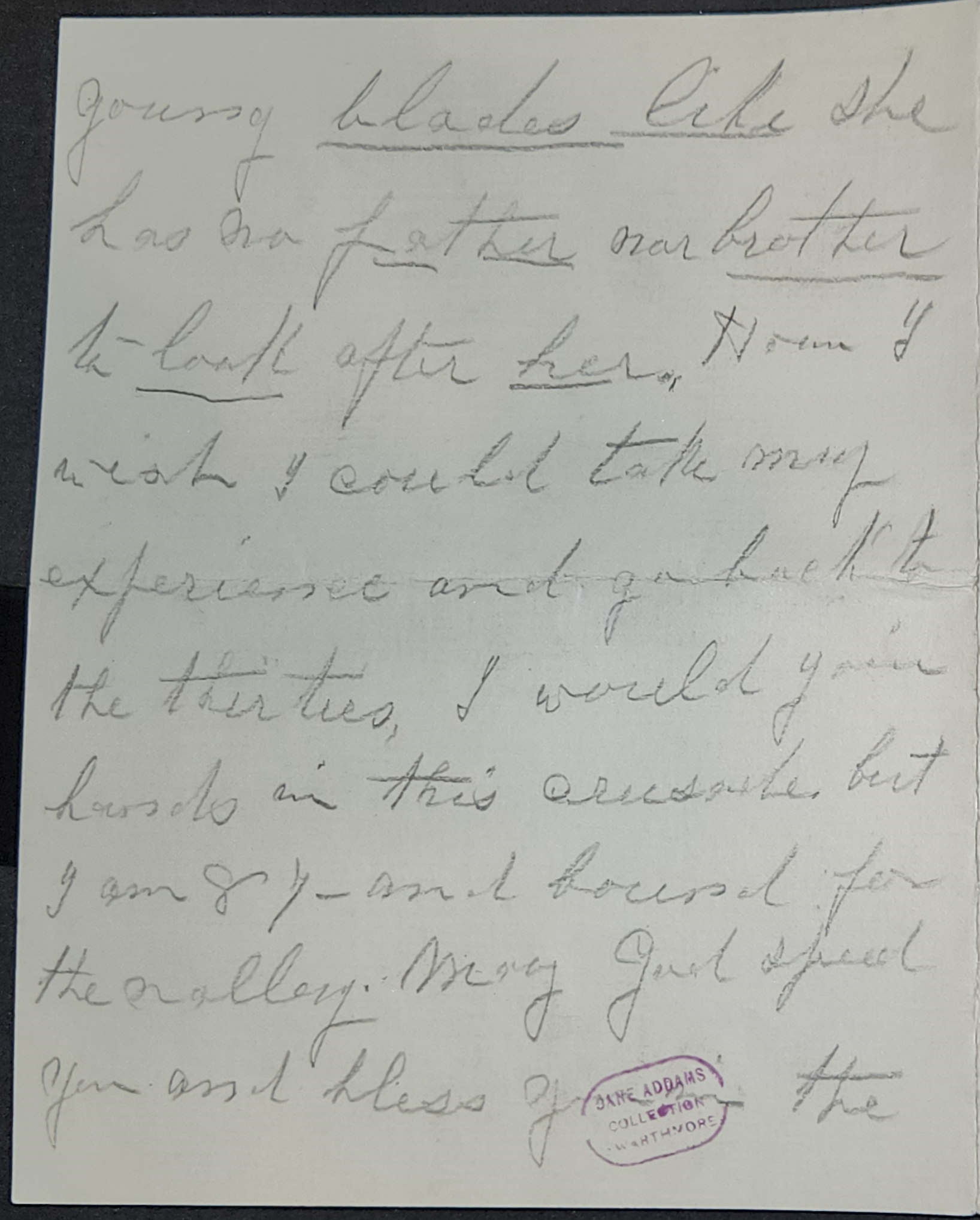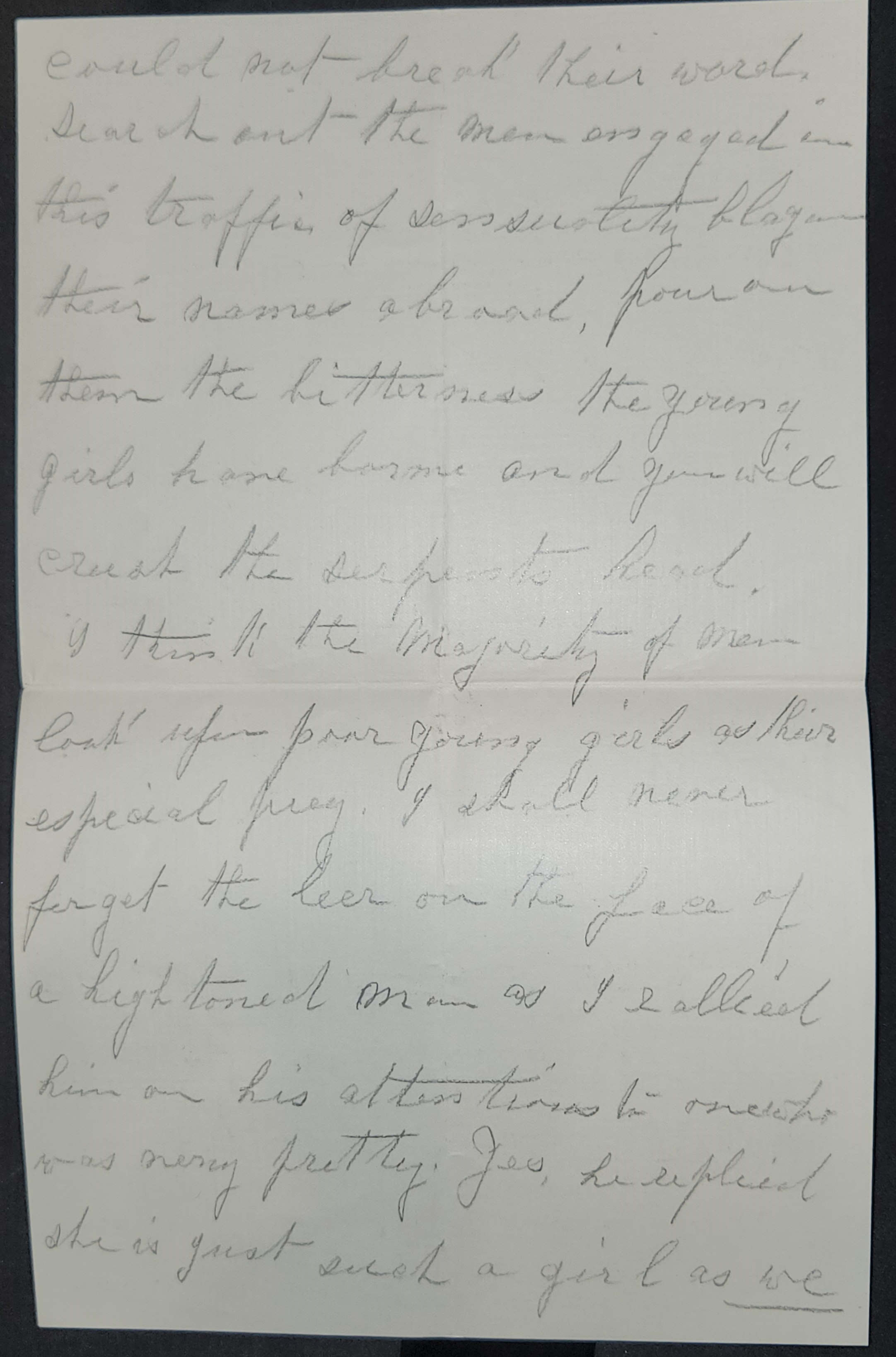 Men will not be [illegible] has been forced by them upon women. I have [also seen?] girls to face a public tribunal and go to jail rather than name their betrayer. Once they had promised and they [page 5] could not break their word. Search out the men engaged in this traffic of sensuality [illegible] their names aboard, pour on them the bitterness the young girls have borne and you will crush the serpents head. I think the majority of men look upon poor young girls as their especial prey. I shall never forget the leer on the face of a high toned man as I rallied him on his attestations to one who was very pretty. Yes, he replied she is just such a girl as we [page 6] young blades like she has no father nor brother to look after her. How I wish I could take my experience and go back to the thirties, I would join [hands] in this crusade but I am 87 -- and bound for the valley. May God speed you and bless you [in] the [page 7] good work, and give this Philistine into thy hand. The little girls O how close they are to my heart.